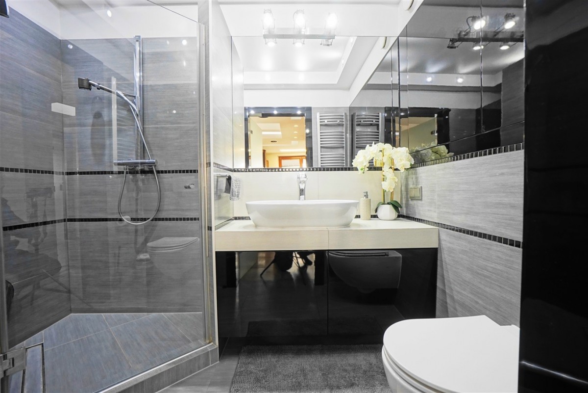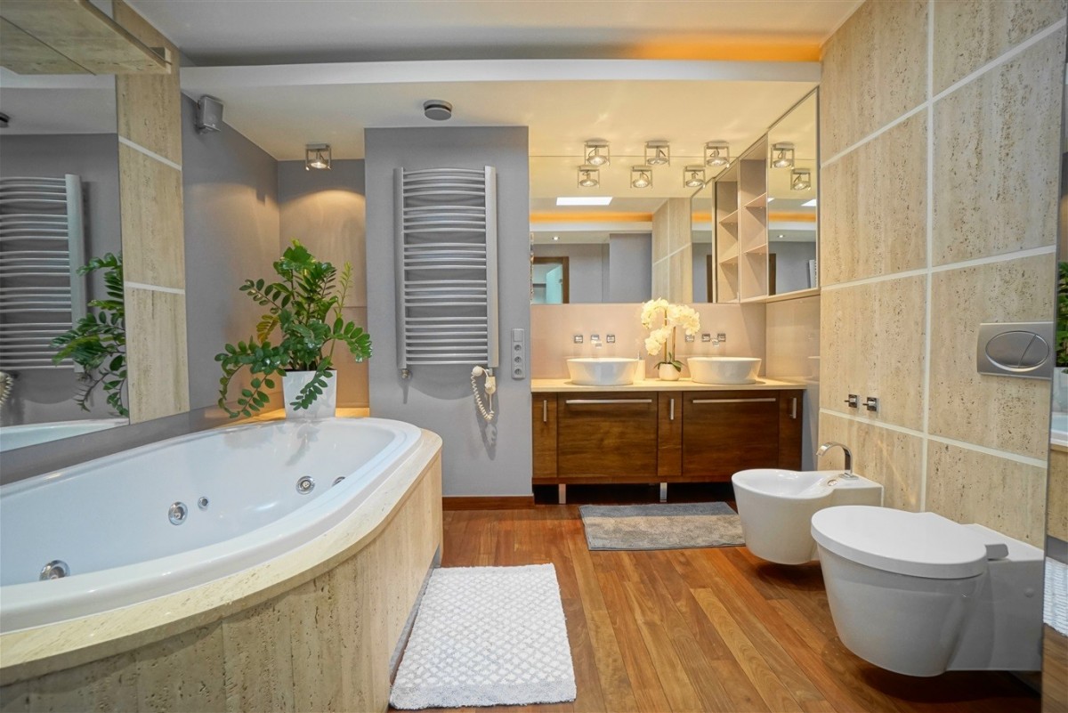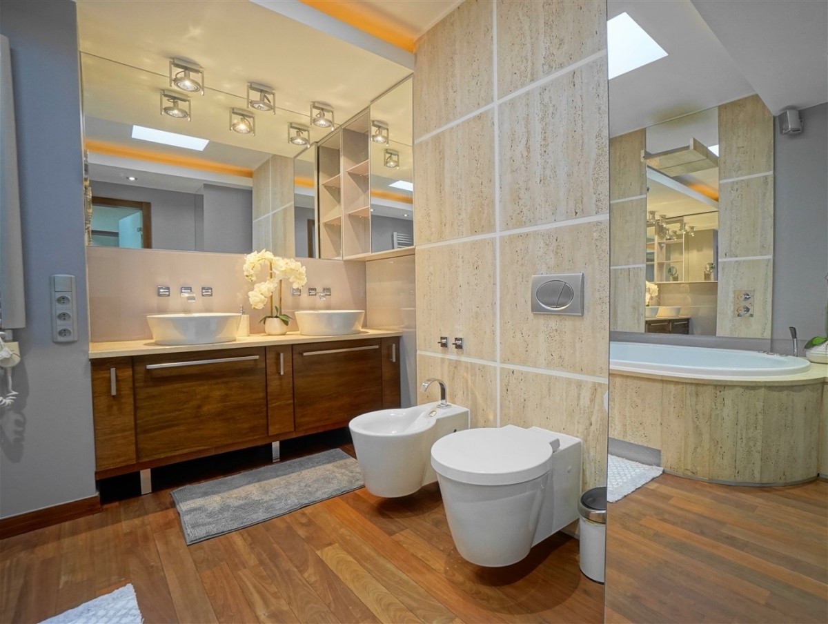 - Pokoju kąpielowego wyposażonego w wannę z jacuzzi oraz "wodospad", dwie umywalki, bidet