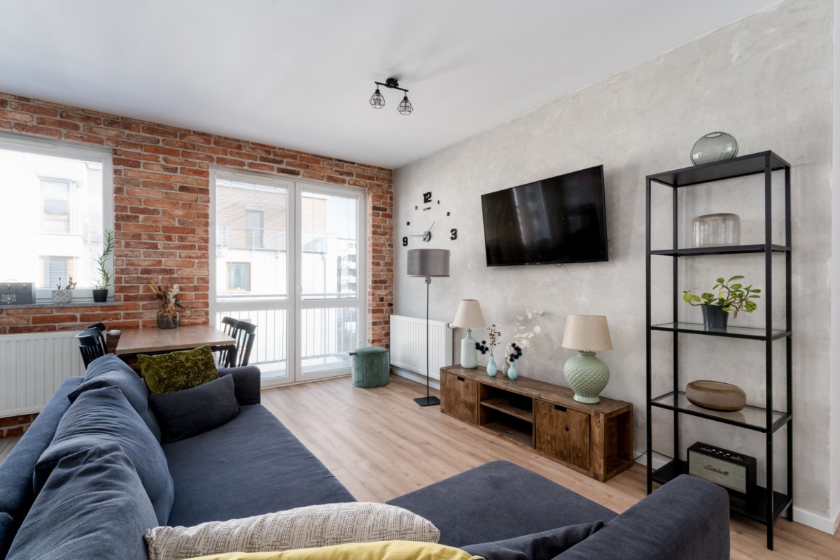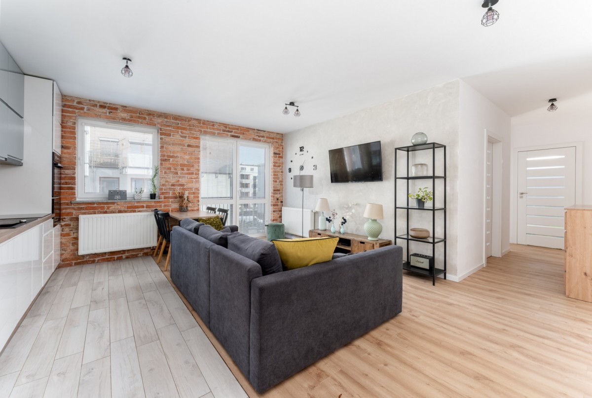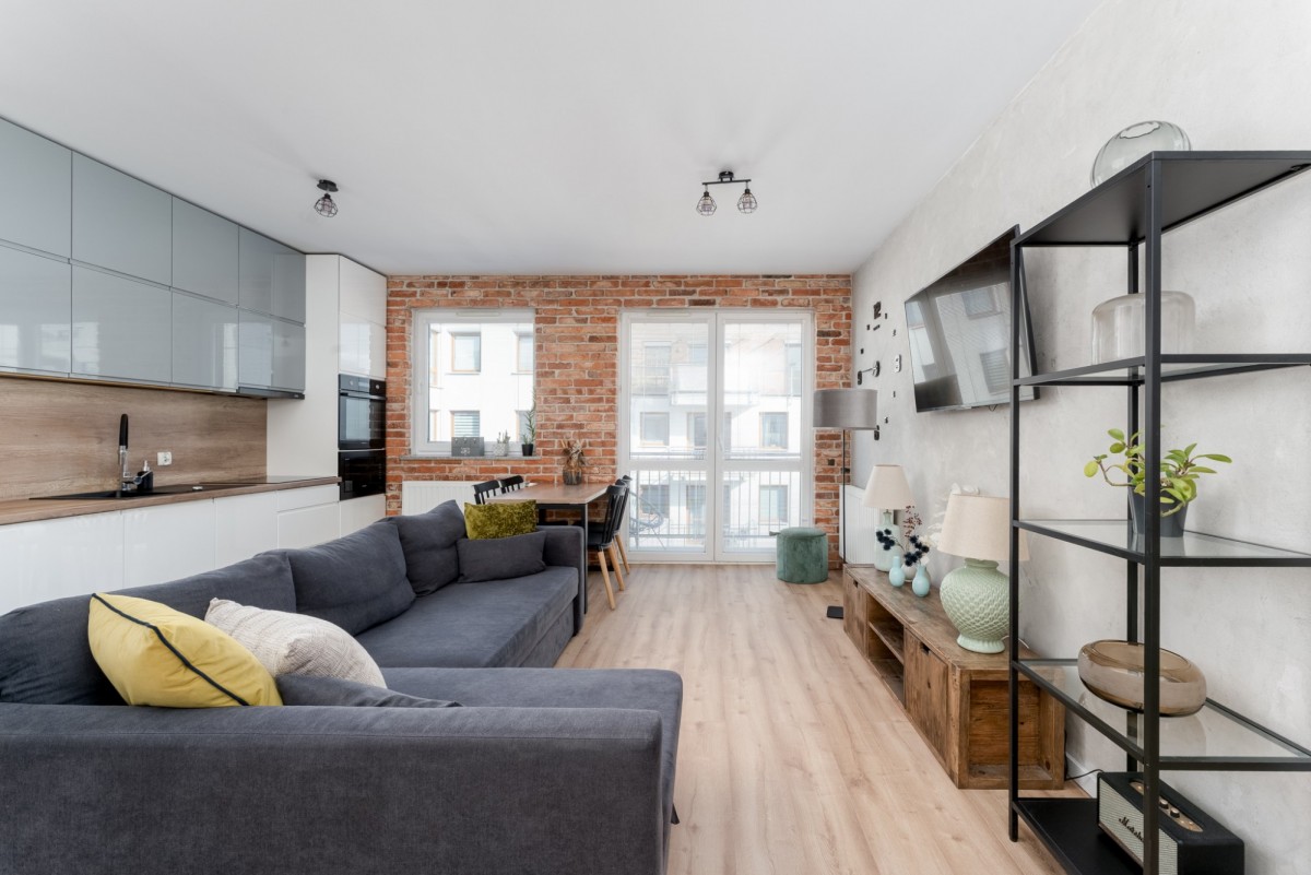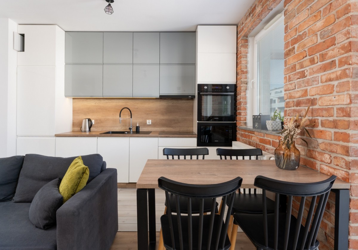 Wygodna kuchnia z dużym blatem wyposażona w sprzęt agd, ściana w salonie wyłożona płytkami ceglanymi, nadającymi klimatyczny, delikatny charakter wykończeniu.