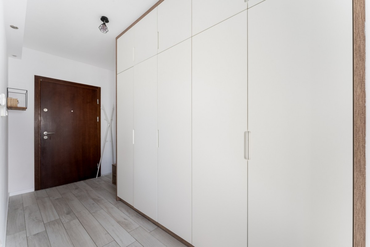 W mieszkaniu znajdują się liczne szafy i schowki, cała zabudowa wykonana została na wymiar.