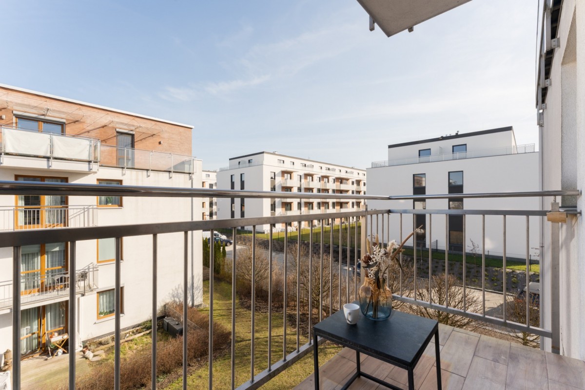 Widok z balkonu jest na wewnętrzne patio oraz zieleń, można usiąść i relaksować się po dniu pracy