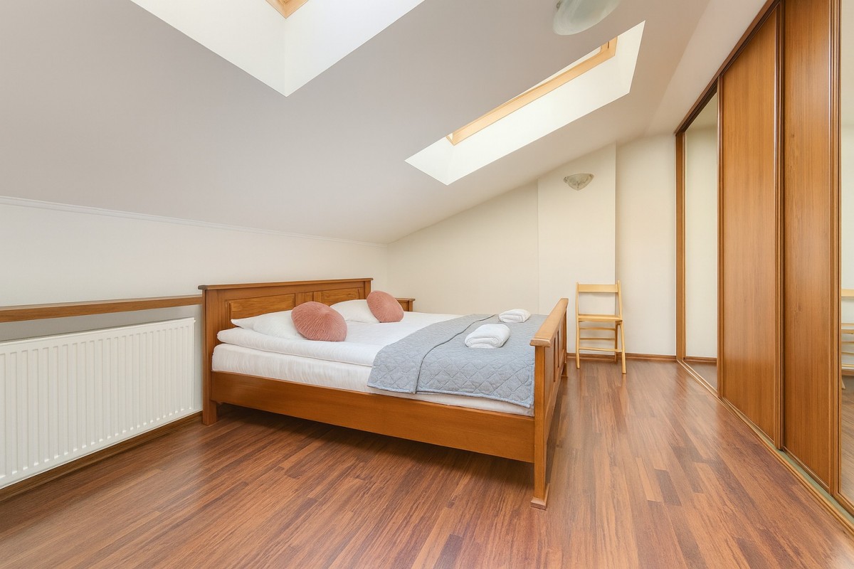 Poziom 2: dwie sypialnie, każda urządzona funkcjonalnie. Jedna z łóżkiem małżeńskim, druga z rozkładaną sofą i antresolą. Łazienka: z prysznicem i pełnym wyposażeniem.