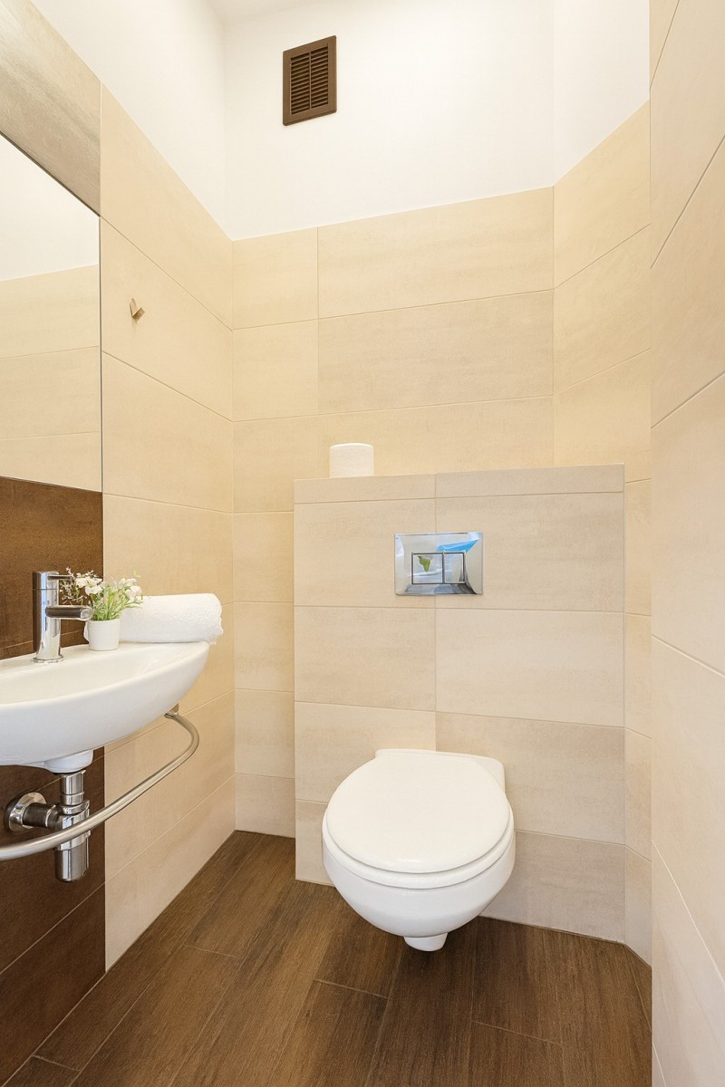 Poziom 1: jasny salon połączony z kuchnią z pełni wyposażoną w sprzęty AGD, toaleta, schowek