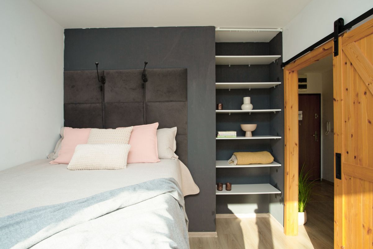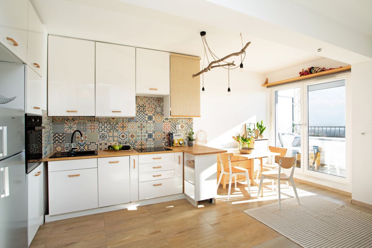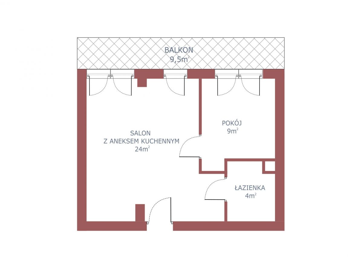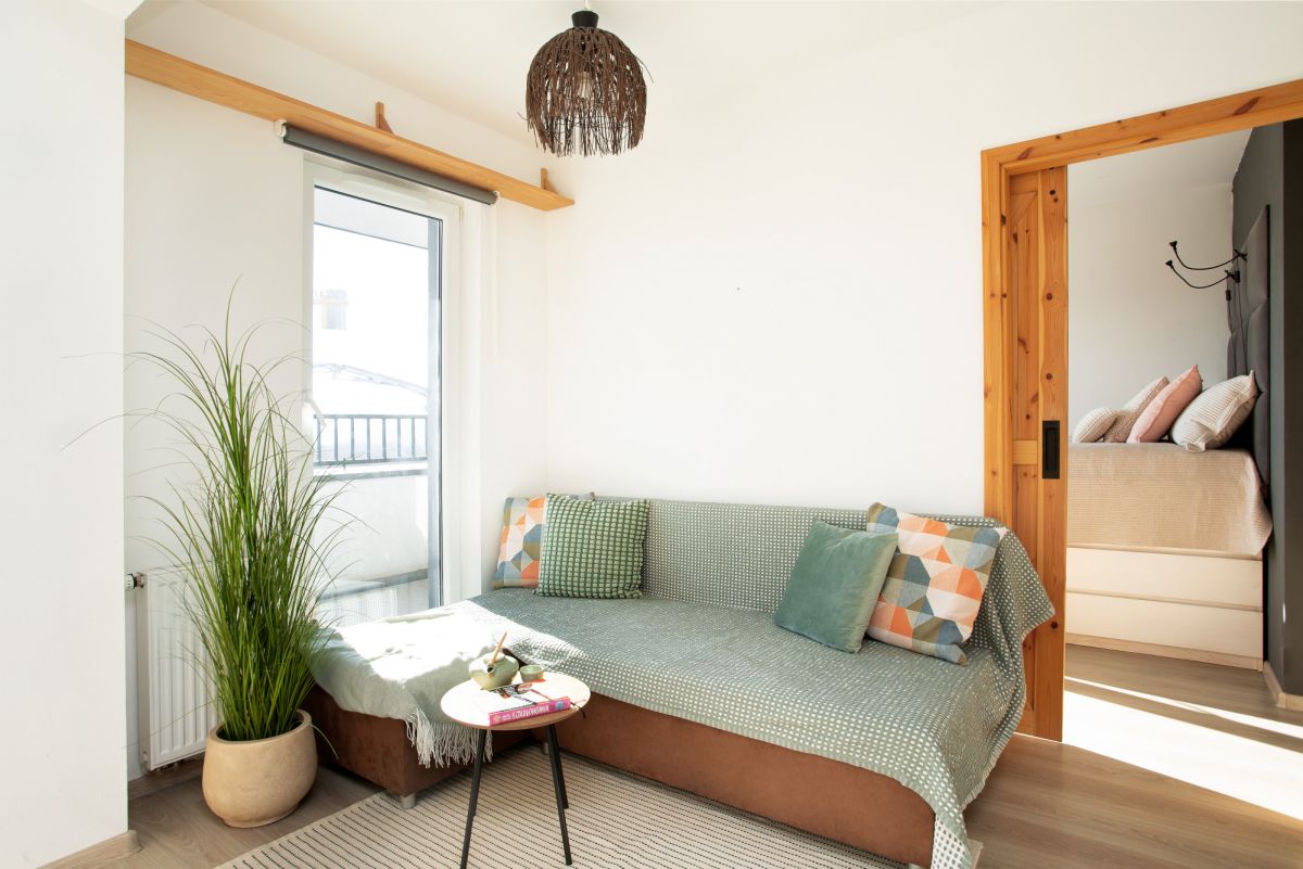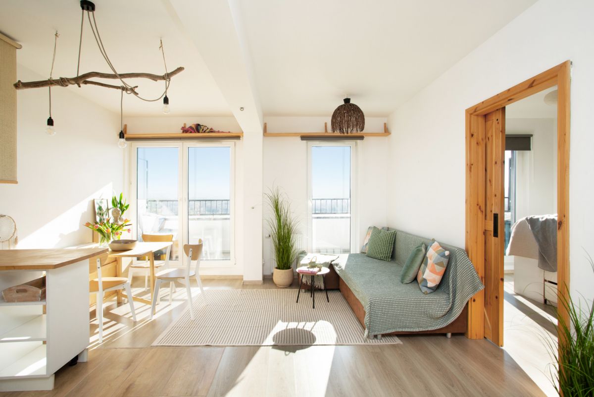 - salon z aneksem kuchennym i wyjściem na balkon,