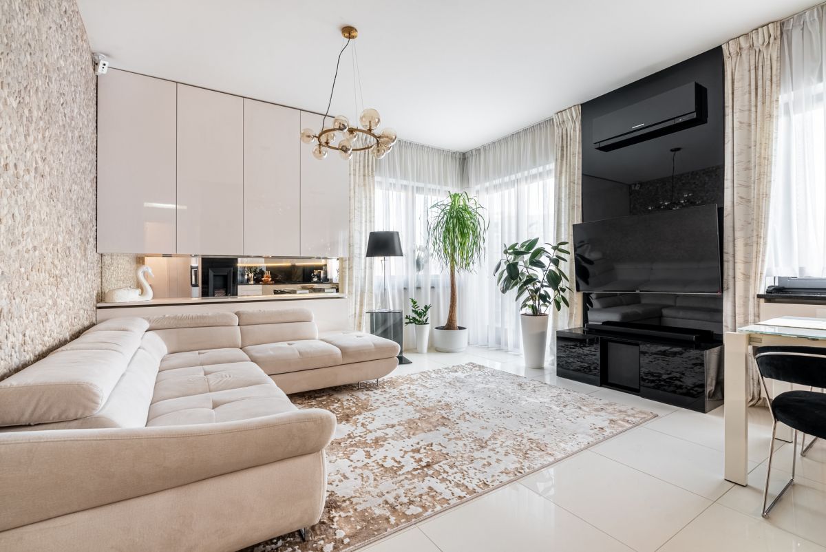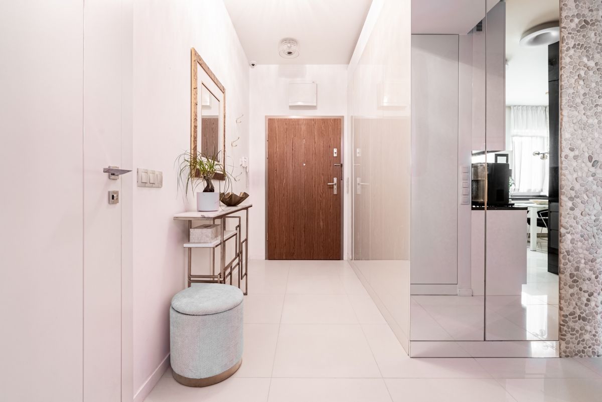 Właścicielka pozostawia w Apartamencie po sprzedaży meble w zabudowie, bez sprzętów ruchomych i lamp w salonie.