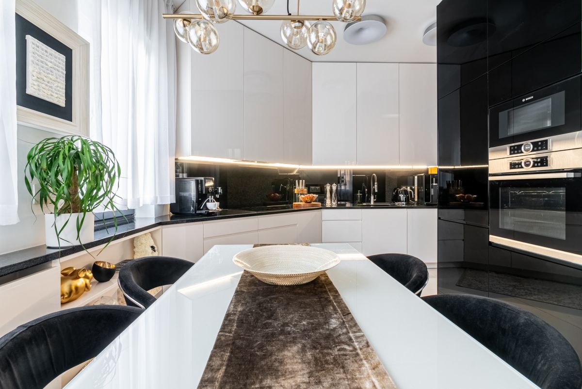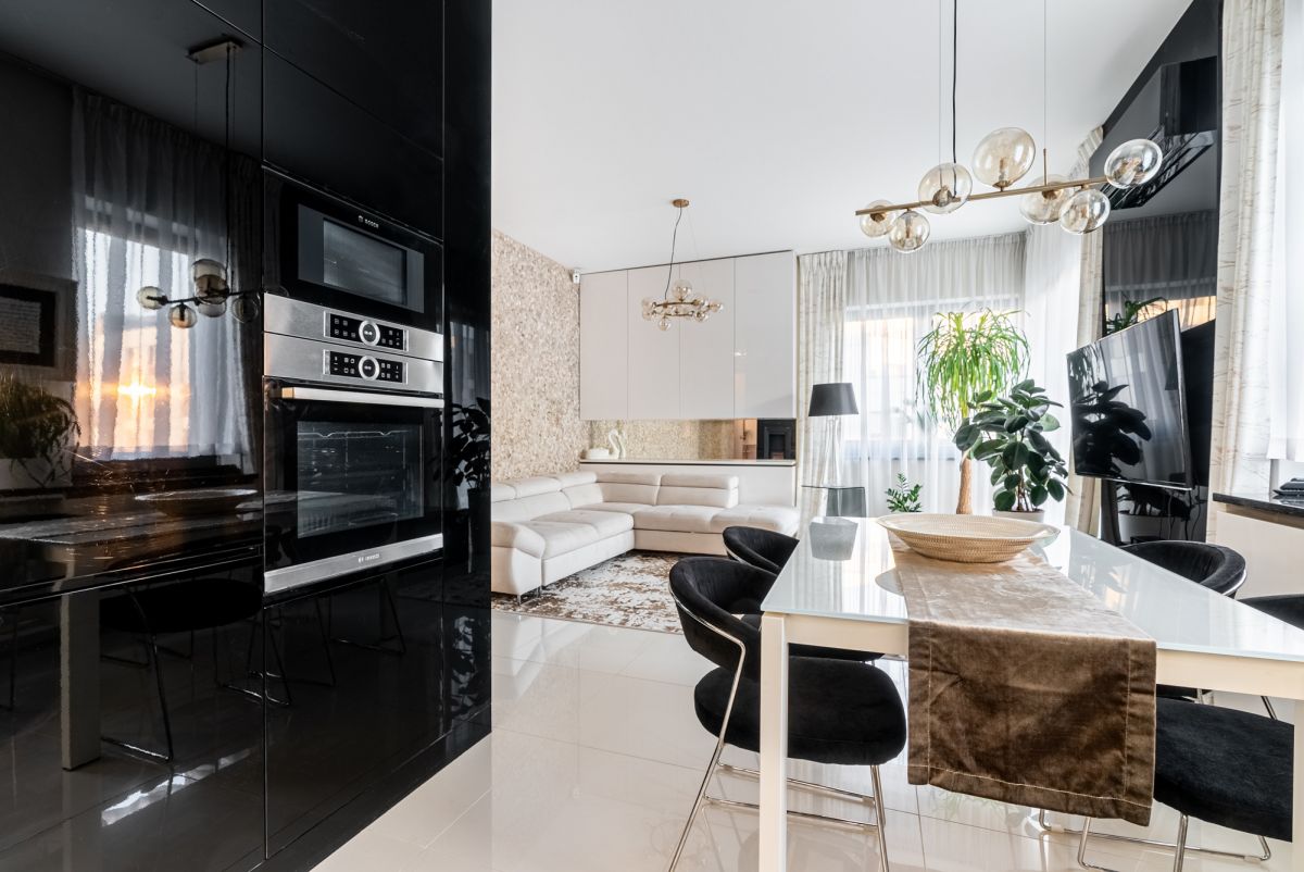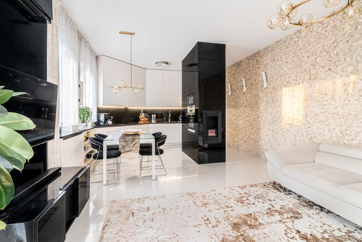 Apartament składa się z ustawnego salonu z częścią jadalnianą i dużym aneksem kuchennym z wyspą na której umieszczone zostały, z jednej strony, sprzęty AGD, z drugiej bio kominek od strony salonu. Południowa wystawa okien w całym mieszkaniu nadaje mu pięknego kolorytu i wnosi wiele energii. W salonie zadbano o ciekawe punkowe oświetlenie, zamontowano również, na jednej ze ścian, ledy które imitują gwiazdki i galaktykę. Z salonu mamy wyjście na spory taras z widokiem na patio osiedla. Aneks kuchenny jest się bardzo ergonomiczny, zawiera głębokie szafki górne i dolne, wyposażony jest w dobry sprzęt AGD.