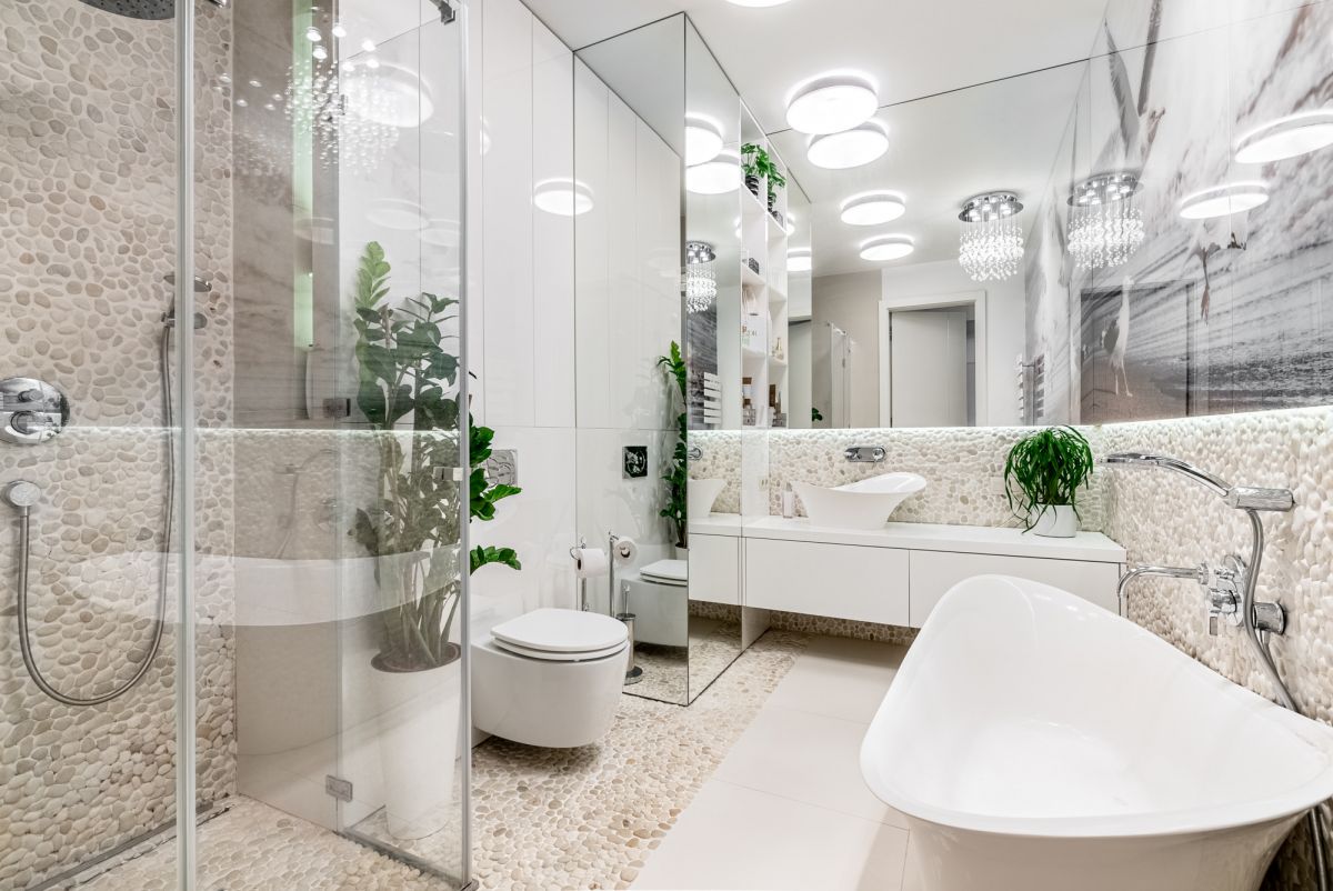To co przykuwa uwagę to piękna łazienka wraz z wc, pokój kąpielowy z wolnostojącą wanną oraz dużym prysznicem liniowym. Na ścianach i podłogach położony jest ozdobny kamień który wprowadza do wnętrza łazienki ciekawą aranżację. Pięknie również prezentuje się w łazience szklany, podświetlany panel z motywami morskimi. Jest dużo przeszkleń, które zasłaniają półki i przestrzeń gospodarczą, przez co łazienka wydaje się jeszcze bardziej okazała.