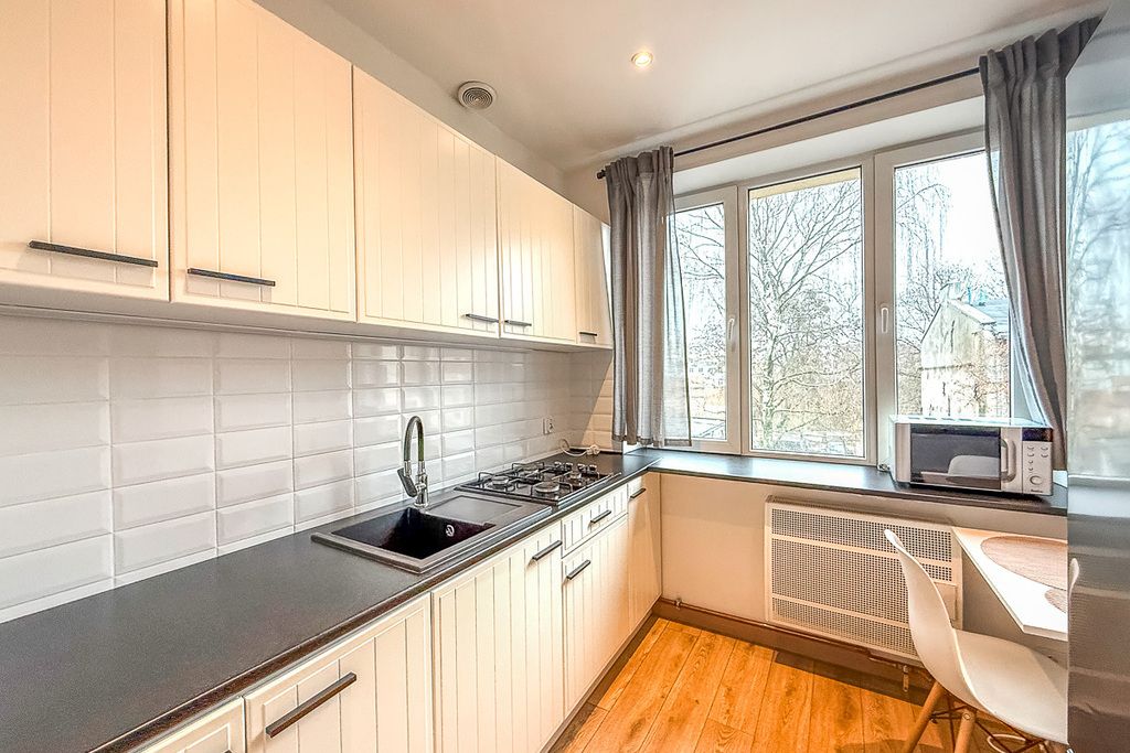 Mieszkanie znajduje się zaledwie 2,7 km od centrum miasta, w cichej ulicy o niskim natężeniu ruchu samochodowego. W pobliżu dostępne są liczne udogodnienia: fitness, bank, restauracje, szkoła, park, plac zabaw, bar, apteka, sklepy, uczelnia (Politechnika Łódzka) oraz przychodnia lekarska.