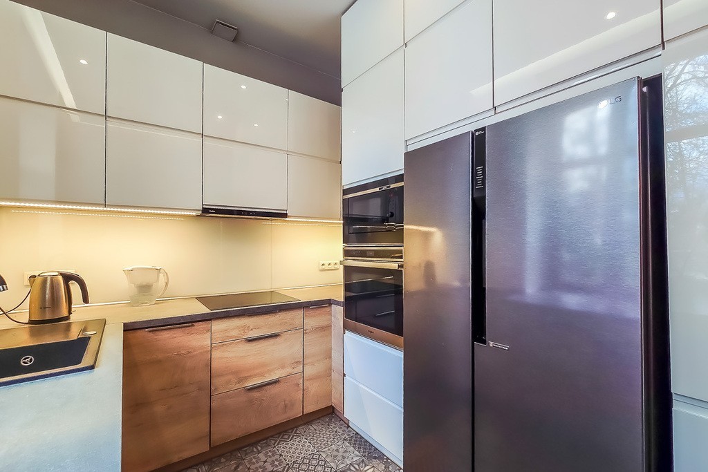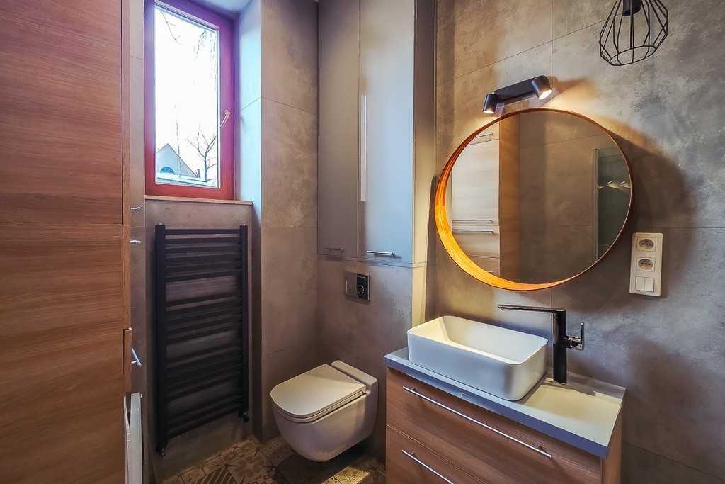 Zagospodarowana każda wolna przestrzeń oraz sprzętem AGD takimi jak lodówka z zamrażarką duża dwudrzwiowa, zmywarka, okap, piekarnik i mikrofalówka w zabudowie, duży blat i duże okno na ogród. Łazienka z oknem wyposażona w prysznic typu walk-in, pralkę, umywalkę, WC oraz grzejnik drabinkowy.