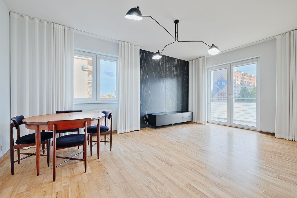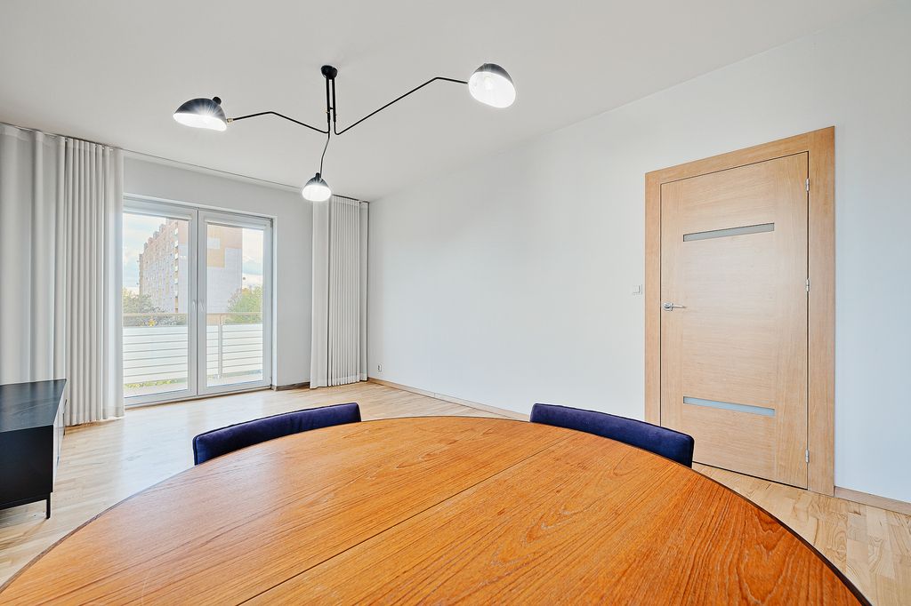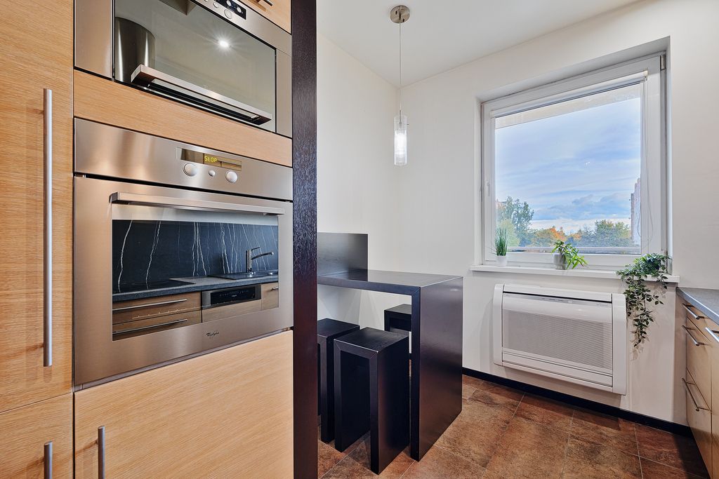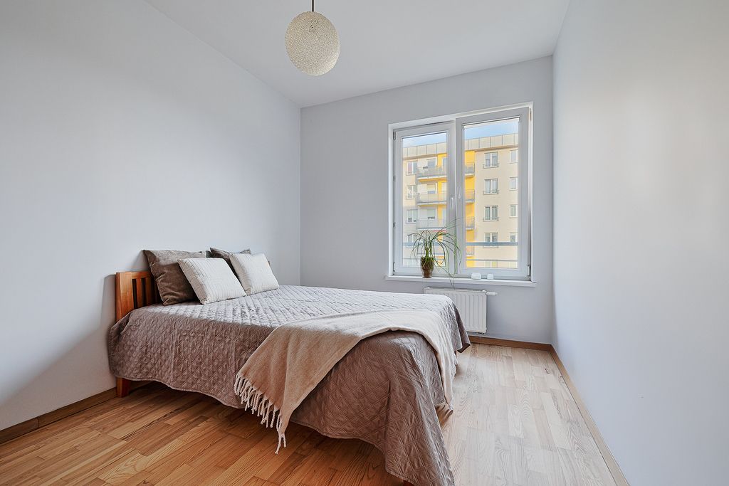 Mieszkanie składa się z dwóch niezależnych pokoi – salonu z wyjściem na balkon oraz sypialni. Kuchnia jest oddzielna i w pełni wyposażona w sprzęt AGD: lodówkę, zmywarkę, mikrofalówkę oraz piekarnik. Lokal jest klimatyzowany. Do mieszkania przynależy miejsce postojowe w garażu podziemnym – dodatkowo płatne 45 000 zł.