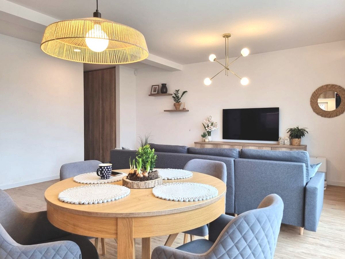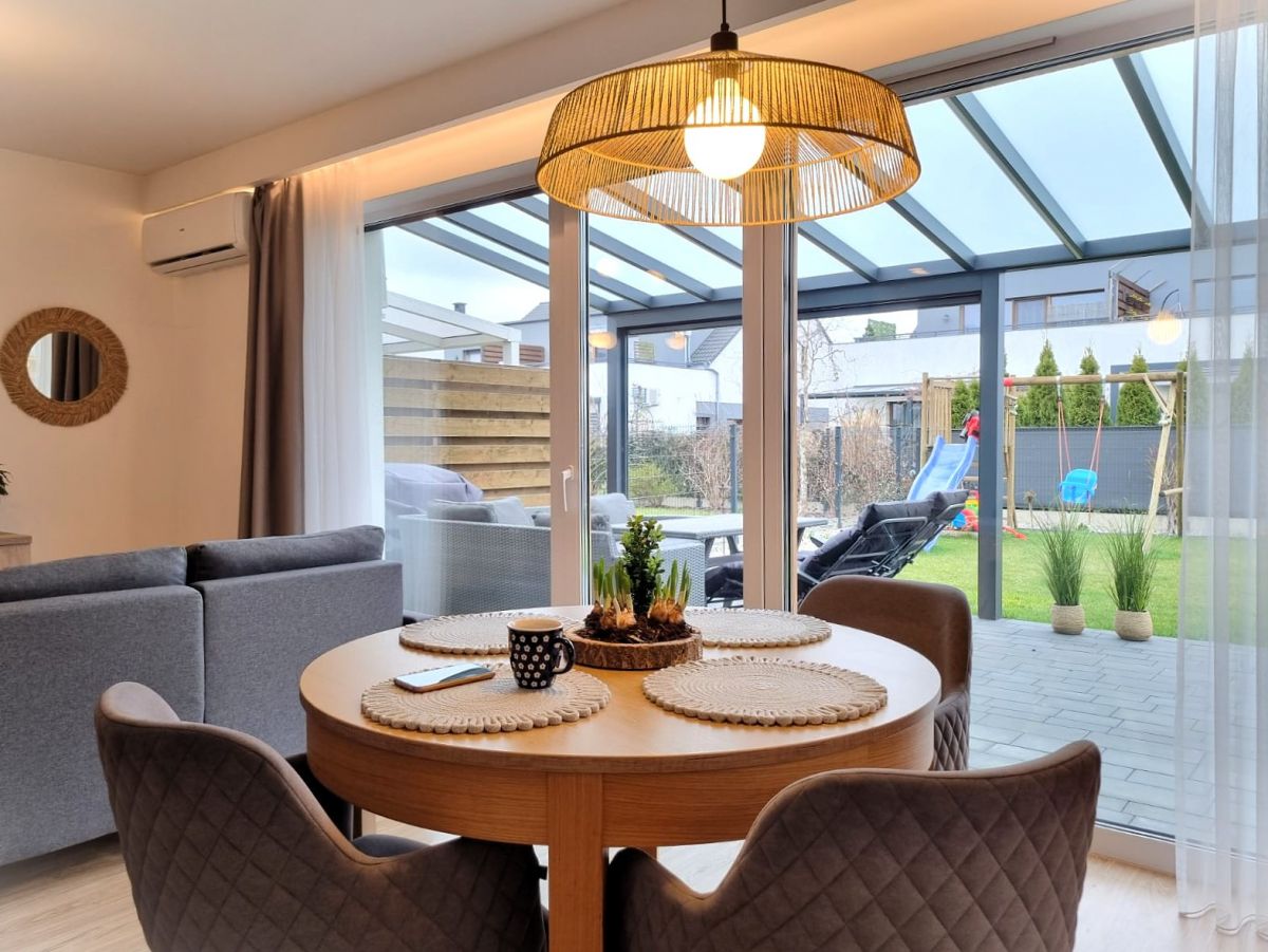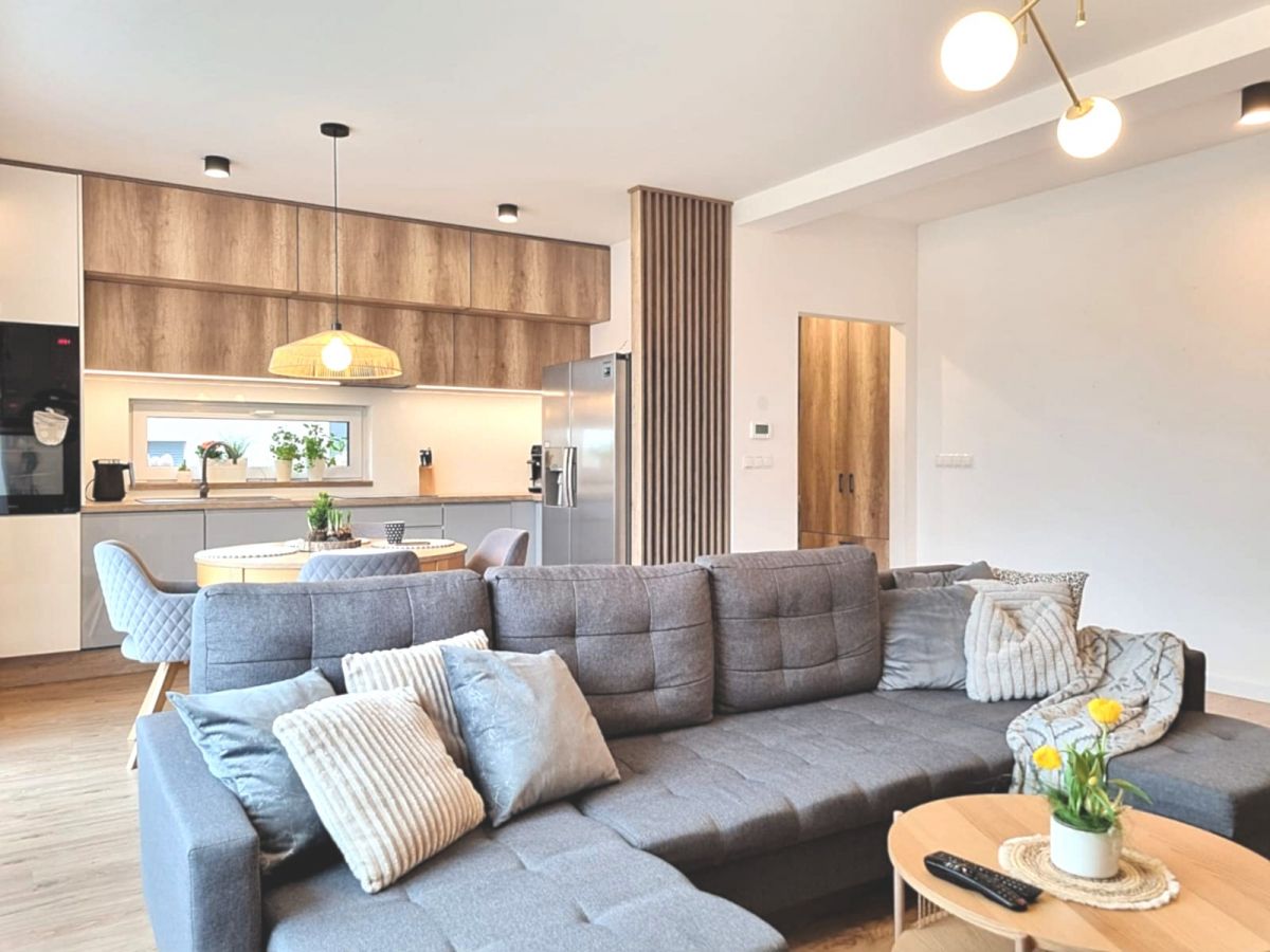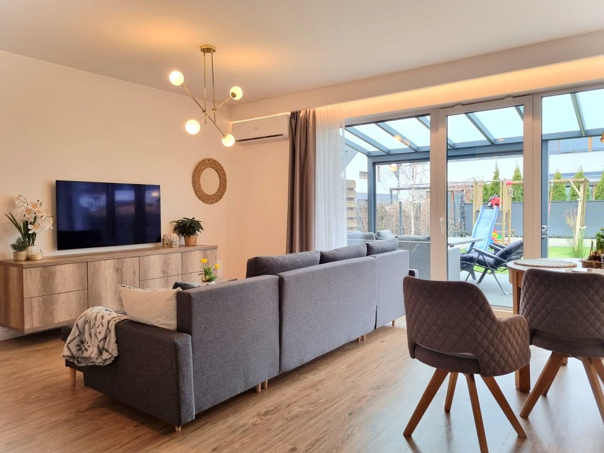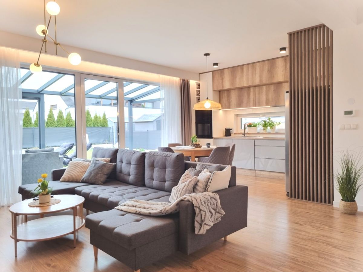 - Salonu z aneksem kuchennym i wyjściem na taras oraz ogród,
