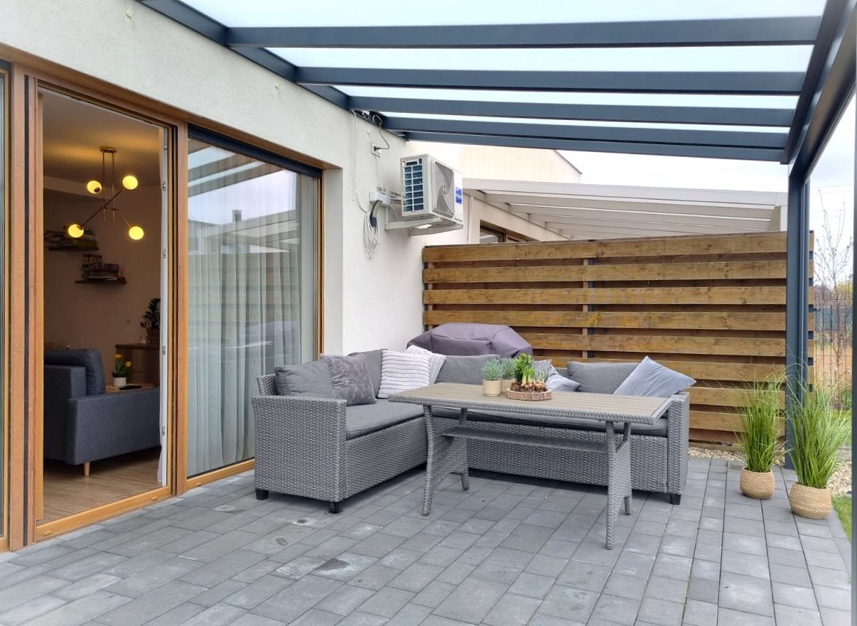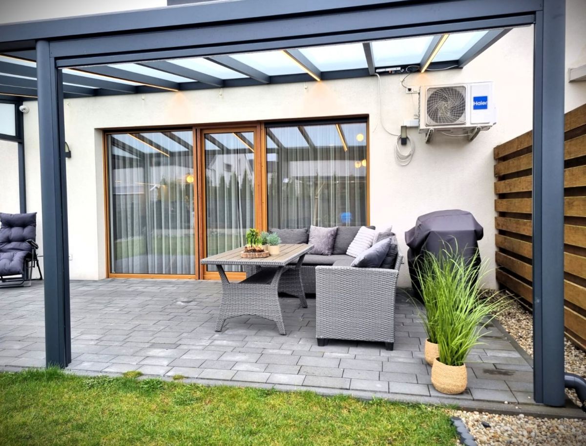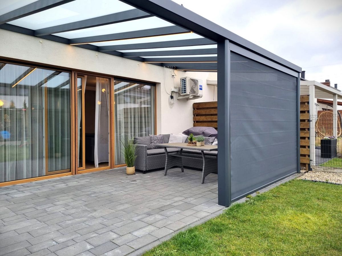 - Taras z aluminiowym zadaszeniem i roletą typu screen