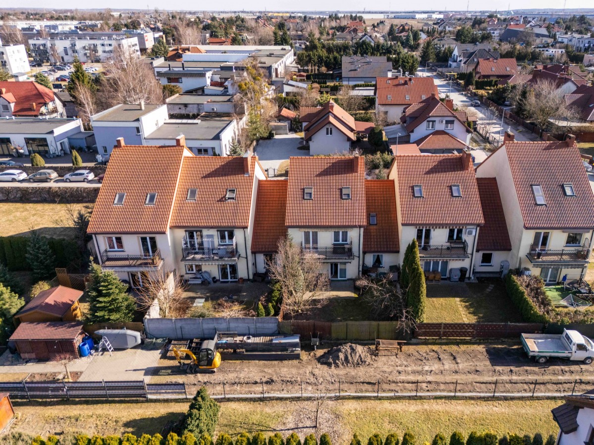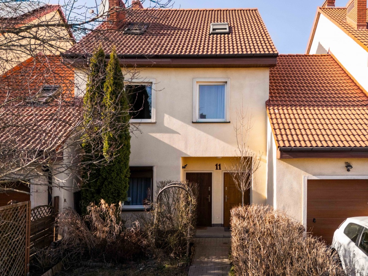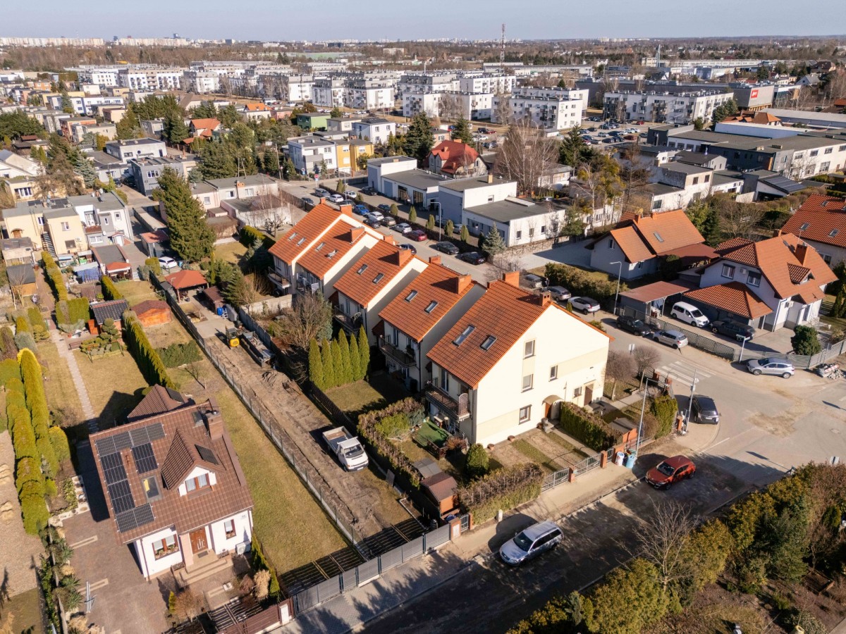 Dwupoziomowe mieszkanie (1. piętro + poddasze użytkowe) położone jest w kameralnej zabudowie szeregowej przy spokojnej ulicy, co zapewnia mieszkańcom poczucie prywatności i komfort codziennego życia.