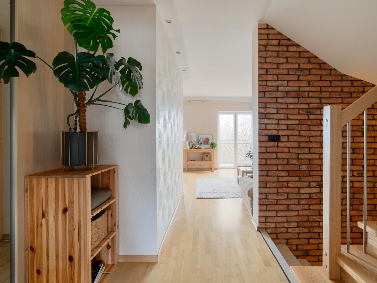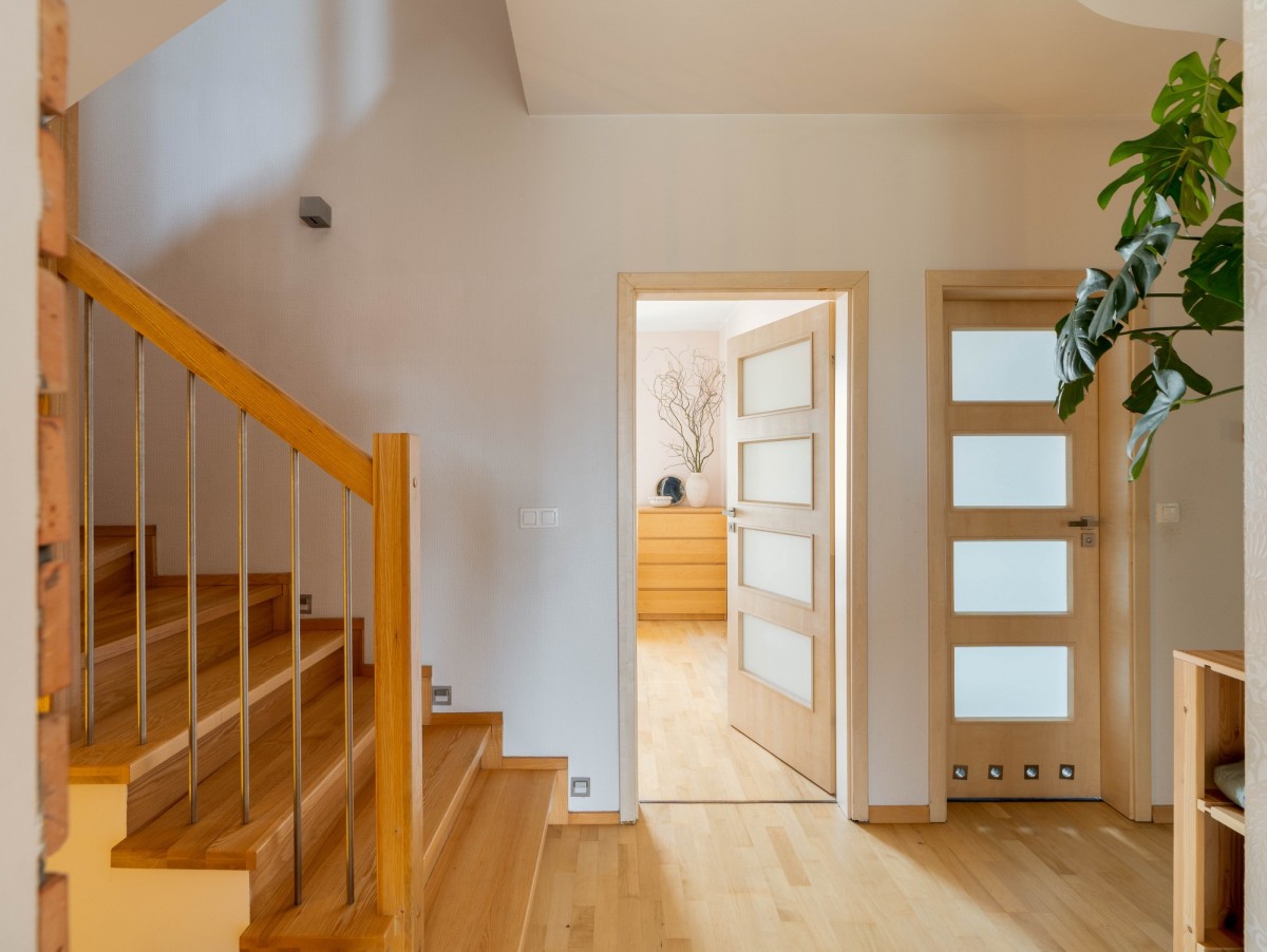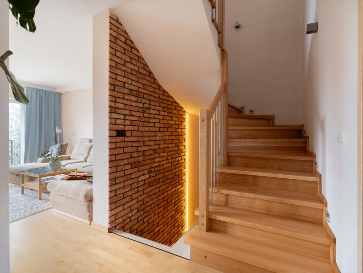 We wnętrzu zastosowano naturalne materiały - drewniane podłogi, schody oraz elementy wyposażenia nadają przestrzeni ciepły, ponadczasowy charakter i tworzą przytulny klimat sprzyjający odpoczynkowi.