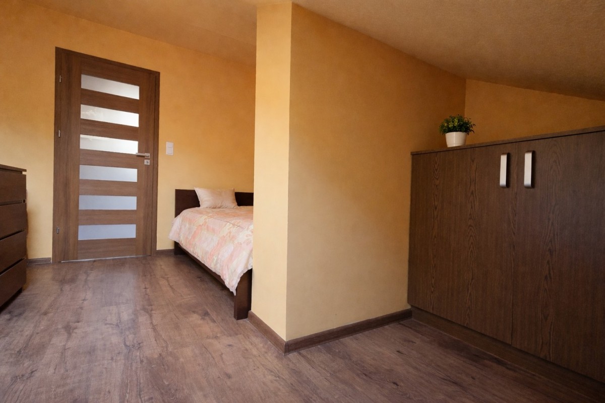 Gotowy produkt: Układ z antresolą (oddzielna sypialnia) pozwala na komfortowy pobyt rodzin lub grup znajomych, co podnosi stawkę za dobę.