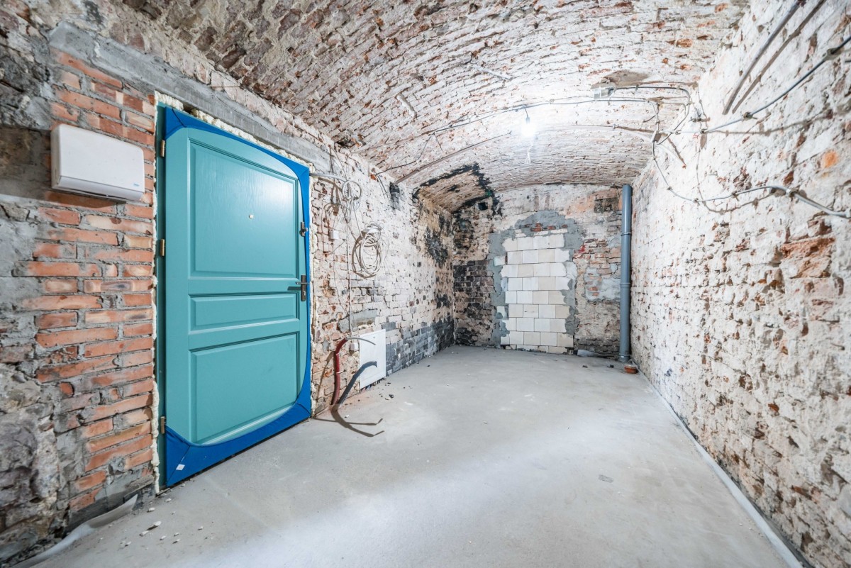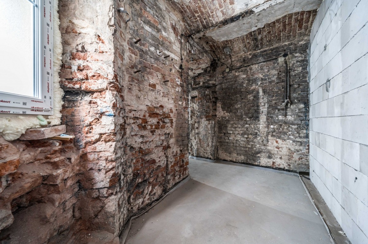 Mieszkanie ma wysokość ok. 2,8 m, a jego wyjątkowego charakteru dodaje łukowa konstrukcja stropu oraz odsłonięte fragmenty ścian z oryginalnej czerwonej cegły, które nadają wnętrzu loftowy klimat.