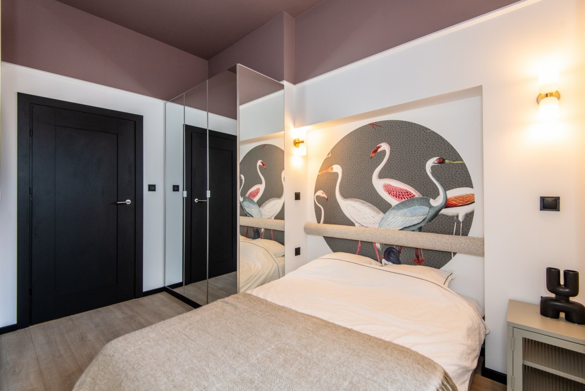 - stylowa sypialnia z dekoracyjną tapetą