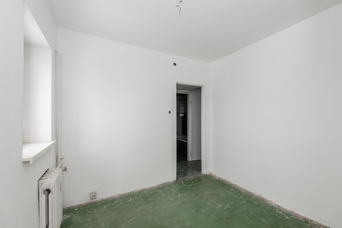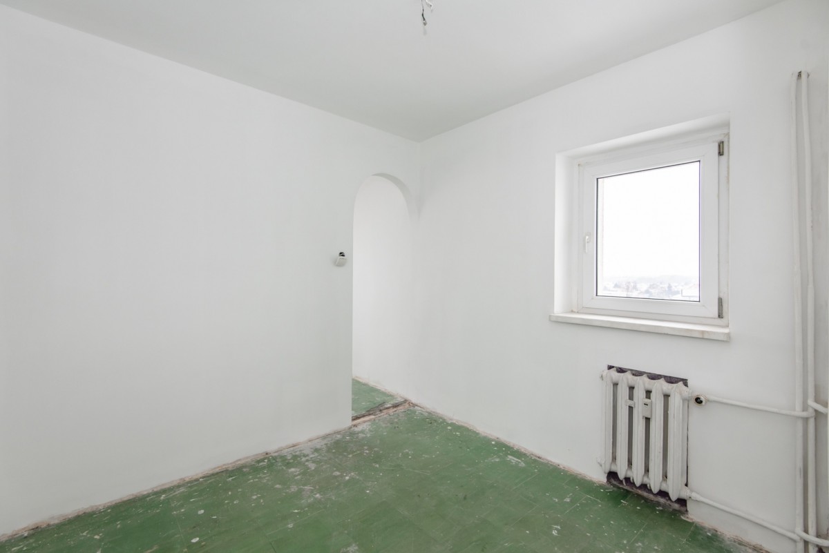 Mieszkanie zostało przygotowane do remontu — usunięto meble, w pokojach wykonano nowe tynki, a dotychczasowe podłogi zostały zdemontowane.