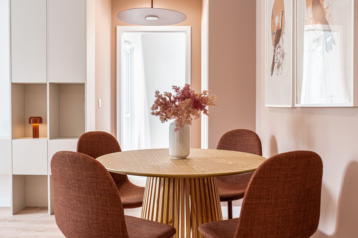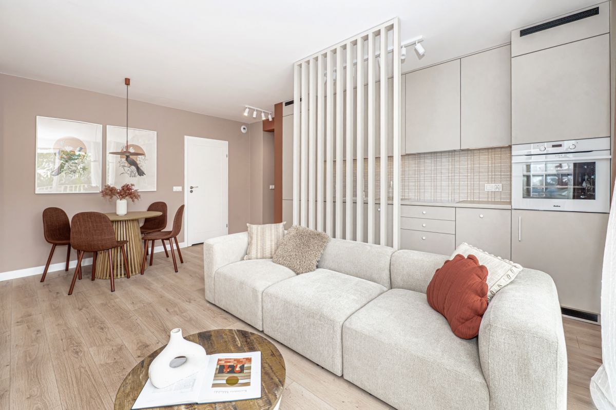 W salonie: elegancka, rozkładana kanapa, stół z czterema krzesłami.