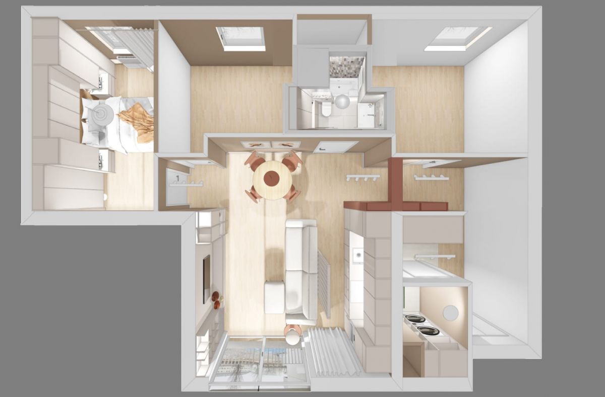 - salon z aneksem kuchennym w kształcie kwadratu, z którego wychodzimy na duży przestronny balkon