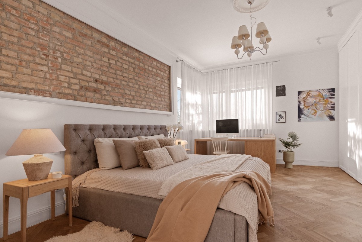 Wyjątkowa aranżacja z miękkimi tkaninami, wysokiej klasy łóżkiem, zabudową stolarską i ścianą z cegły. Wysokie, jasne wnętrze zapewnia poczucie spokoju i komfortu.
