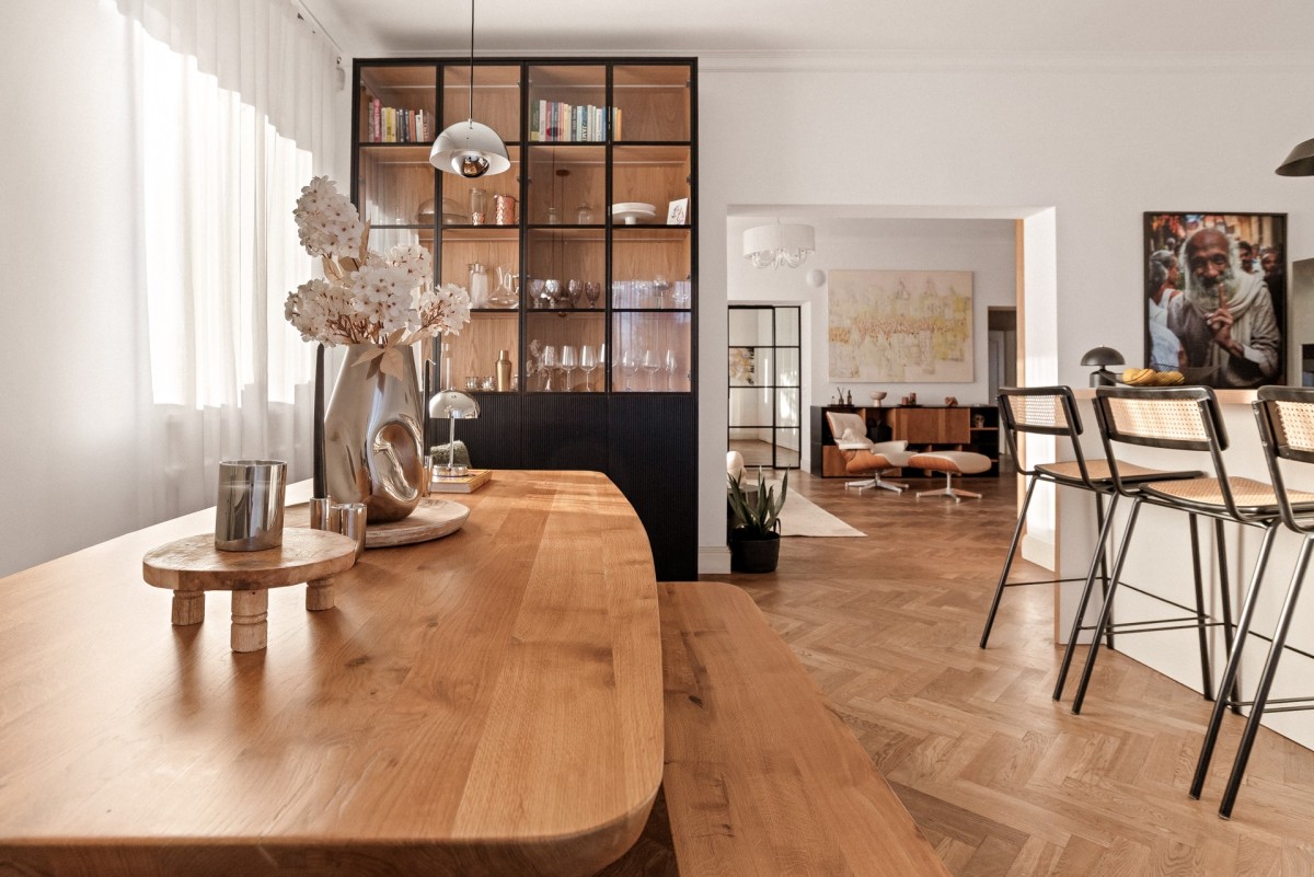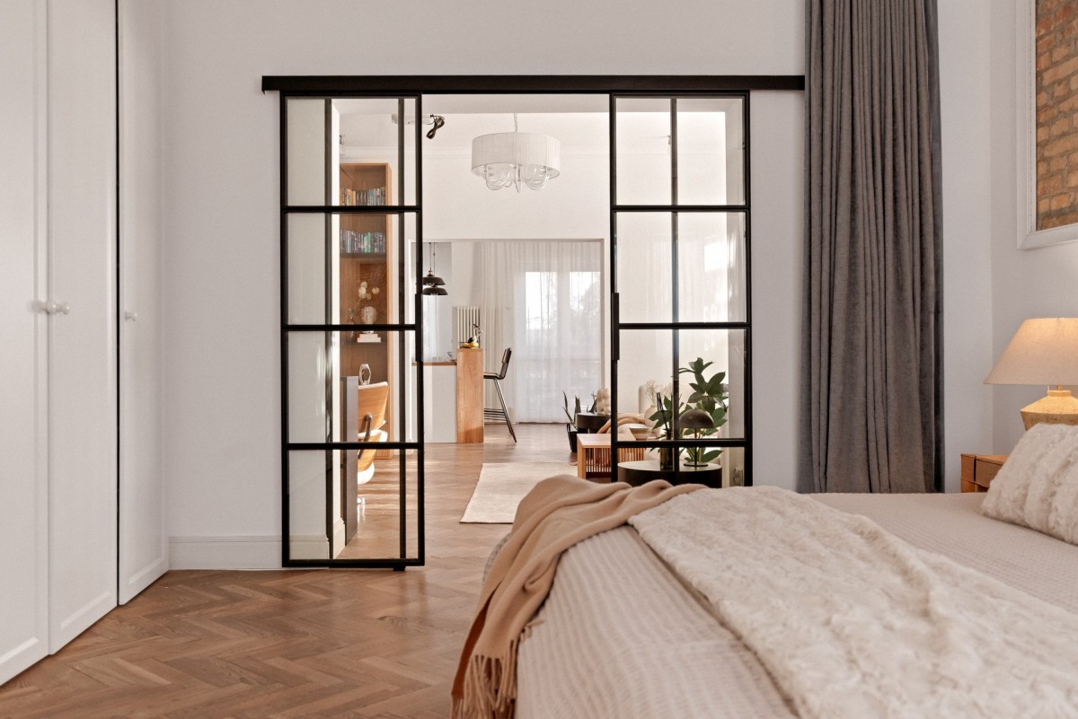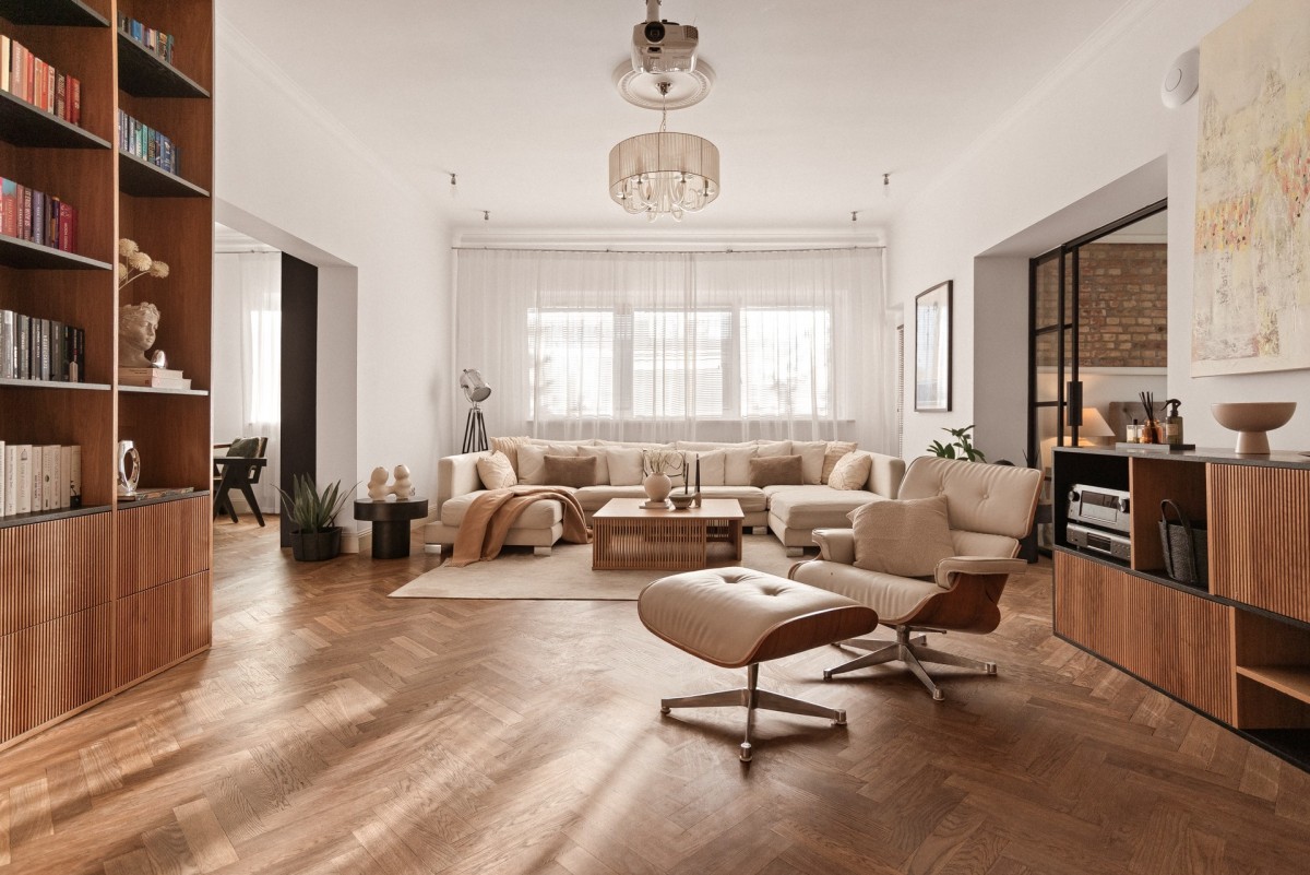 Wnętrze zostało urządzone z dbałością o każdy detal: oryginalny parkiet, ściany z cegły, harmonia beżów i naturalnego drewna, szkła, przemyślana gra światła oraz funkcjonalny układ pomieszczeń tworzą atmosferę ponadczasowej elegancji.