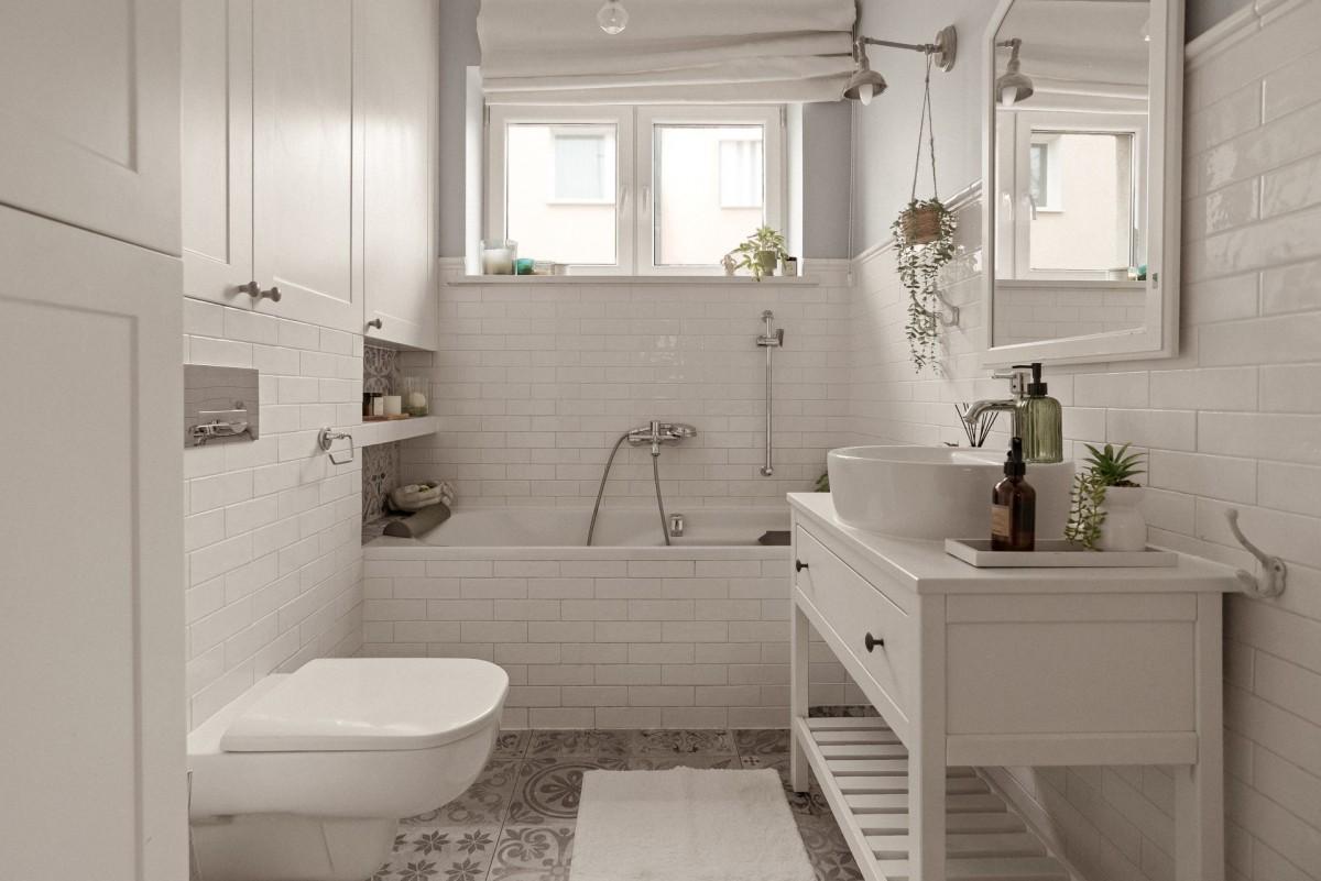 pierwsza z wanną, jasnymi kaflami i wygodną zabudową,