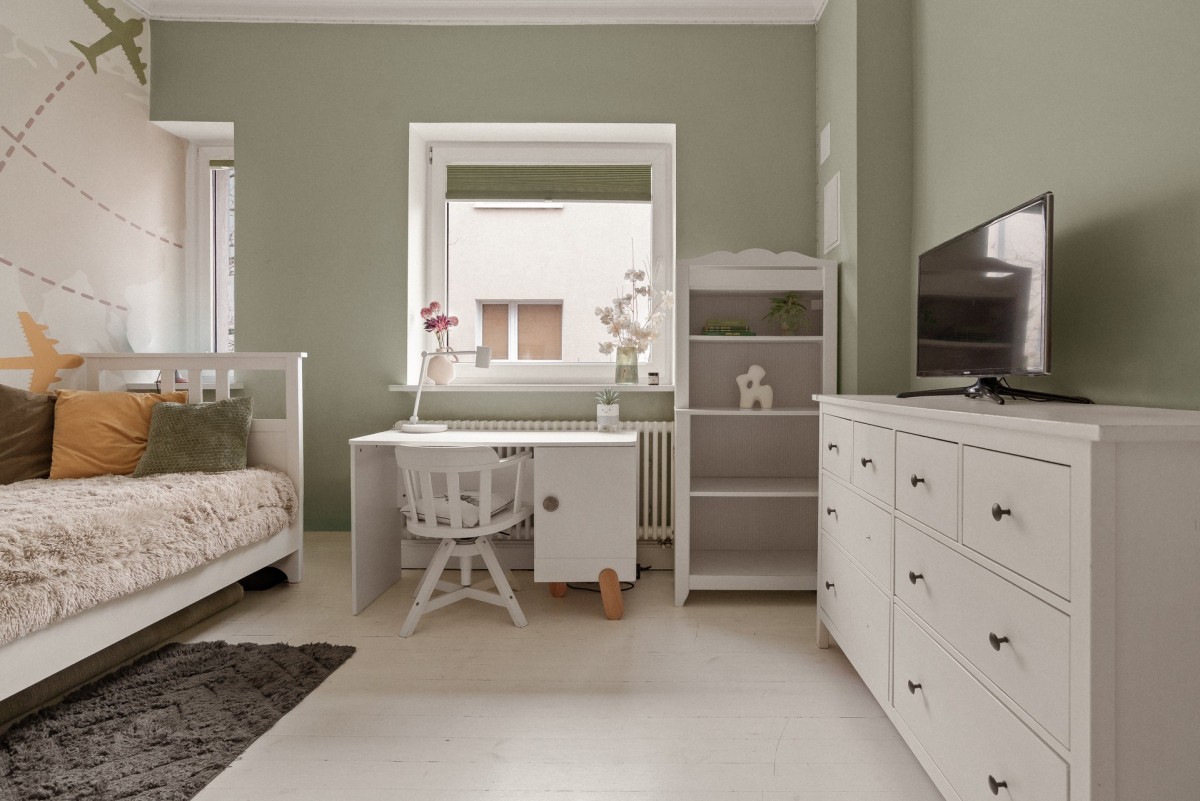 Dwa dodatkowe pokoje, aktualnie zaaranżowane jako gabinet i pokój dziecięcy, dają szerokie możliwości adaptacji — przestrzeń do pracy, pokój gościnny lub druga sypialnia.
