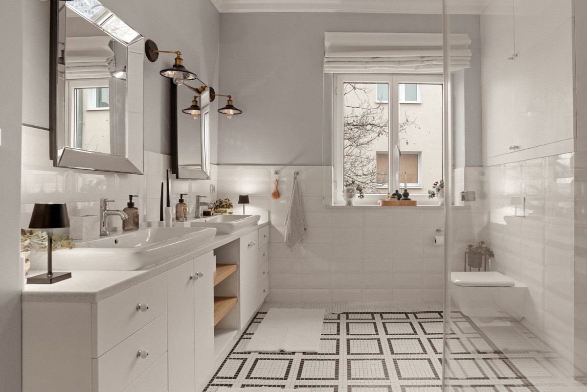 druga - reprezentacyjna, przestronna, z prysznicem walk-in i dwiema umywalkami.