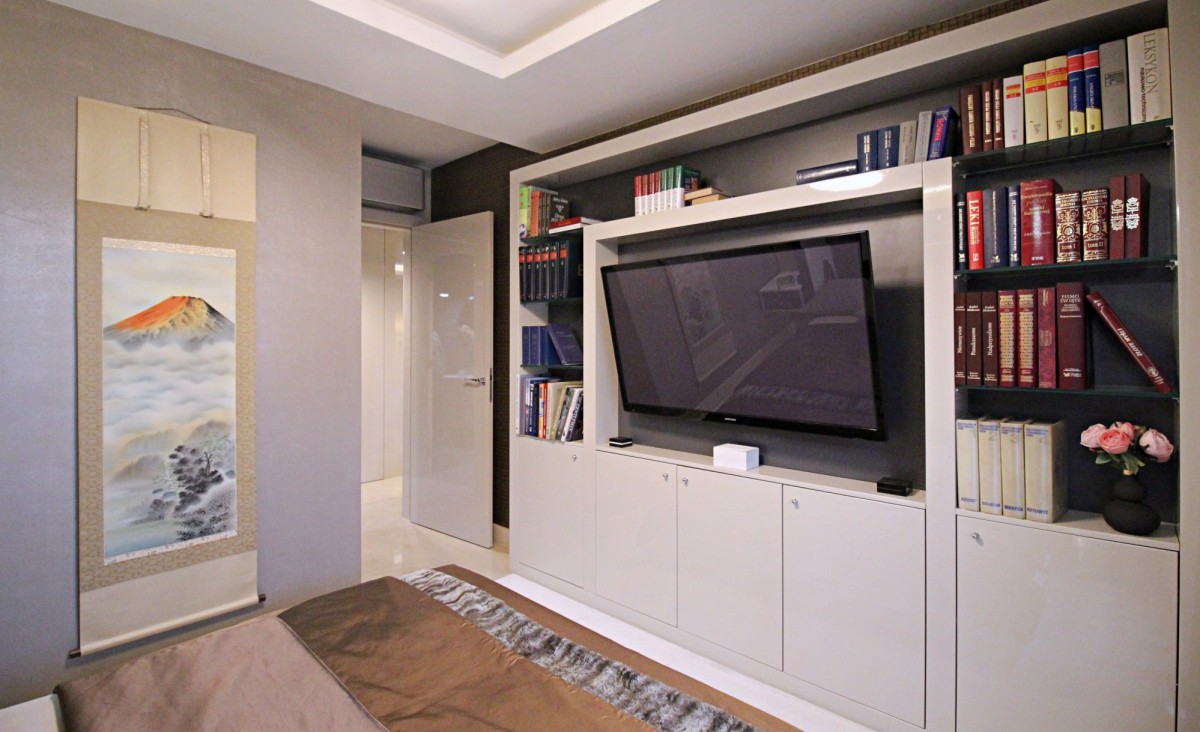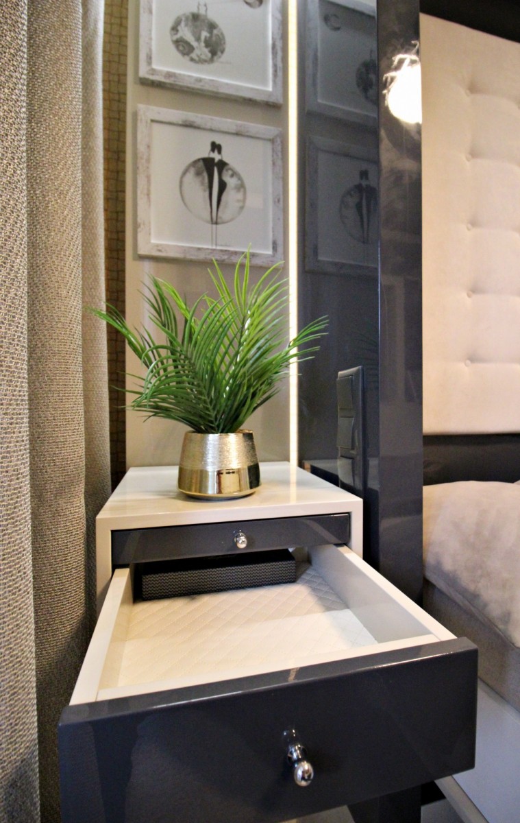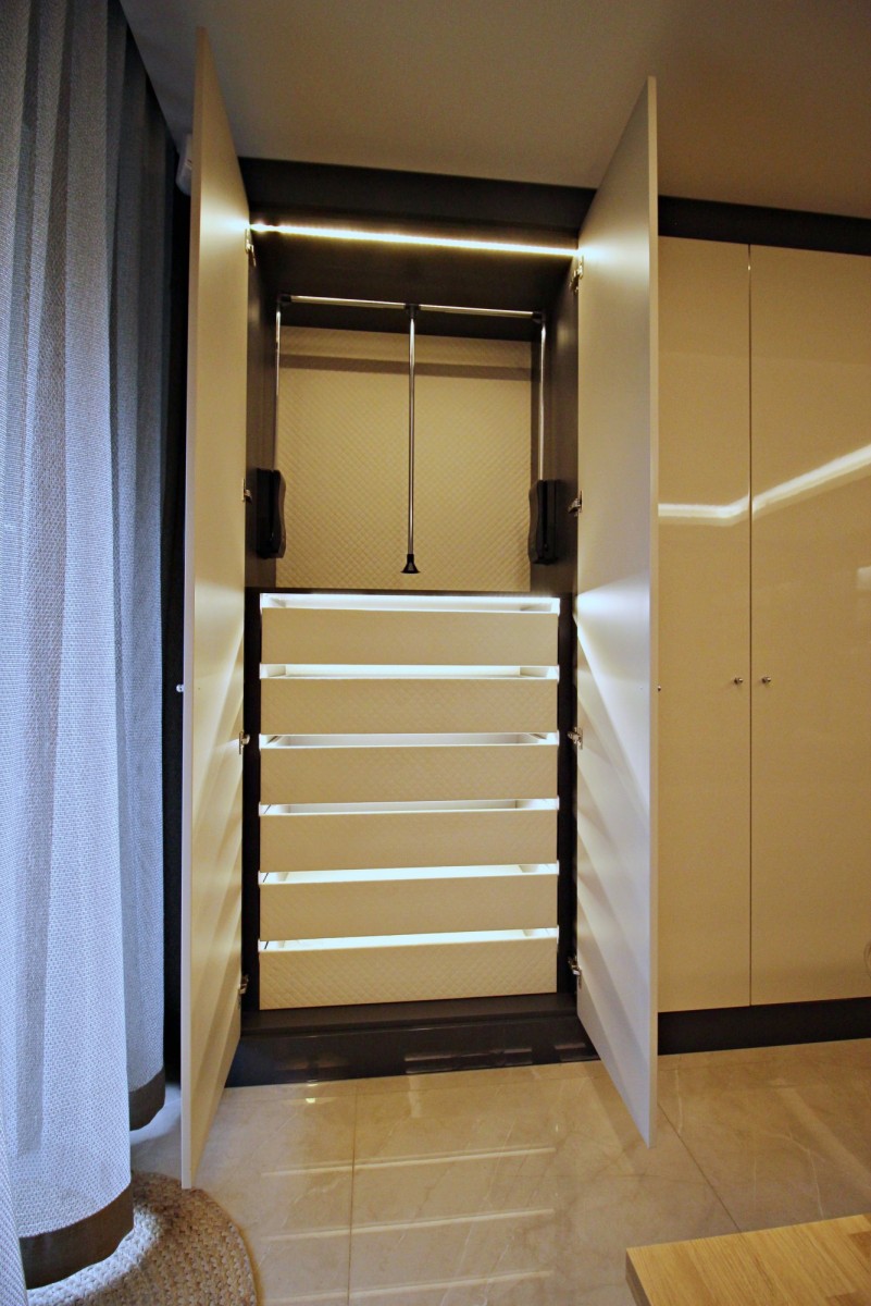 Cała zabudowa meblowa w salonie, sypialni, aneksie kuchennym i łazience została wykonana na wymiar, szuflady wyłożone naturalna skórą .