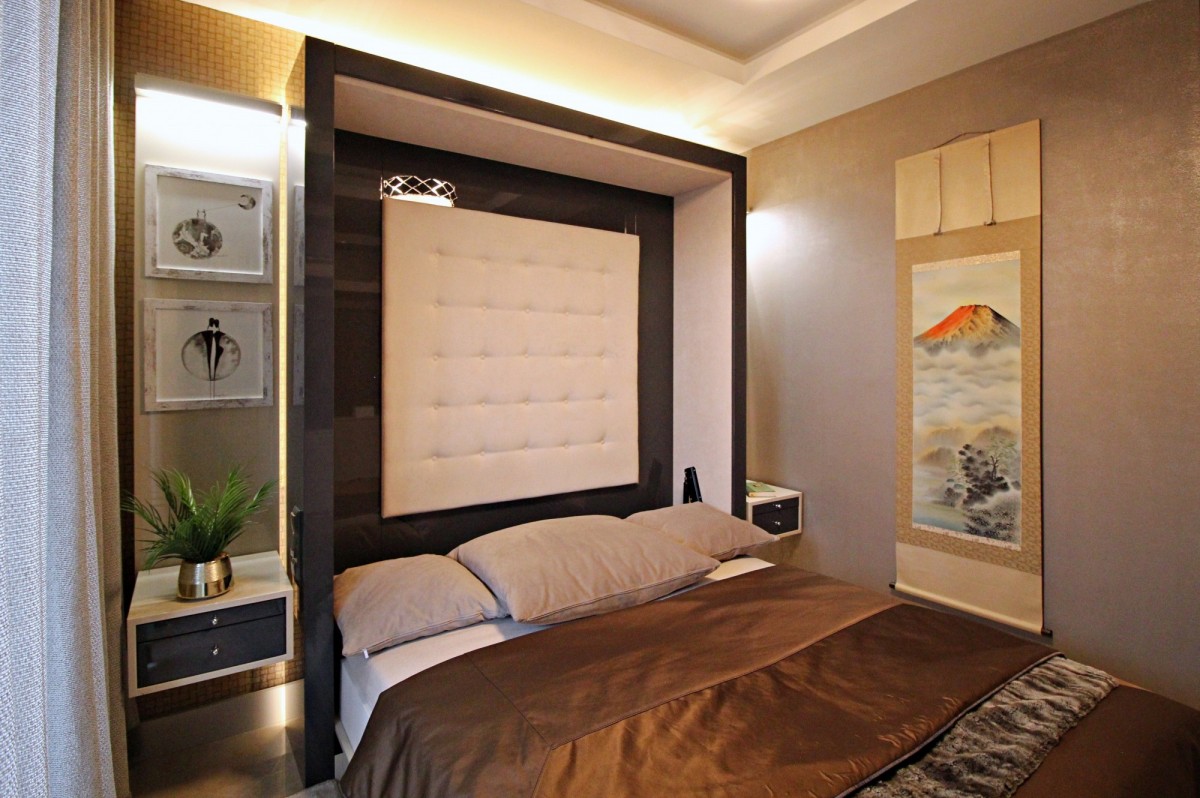 Apartament posiada funkcjonalny podział na strefę dzienną i sypialnianą w kolorystyce beżowo-szaro-białej , oddzielone przesuwanymi lustrzanymi drzwiami .
