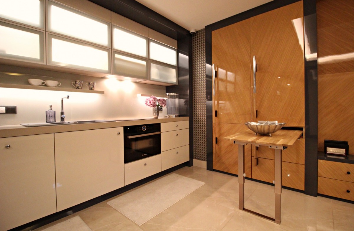 Oferta obejmuje pełne wyposażenie zarówno meble jak i sprzętu AGD wysokiej klasy : pralka i suszarka Bosch , płyta elektryczna i piekarnik Bosch, lodówka Liebhaber, zmywarka Siemens, zlewozmywak kuchenny z młynkiem firmy Franke.