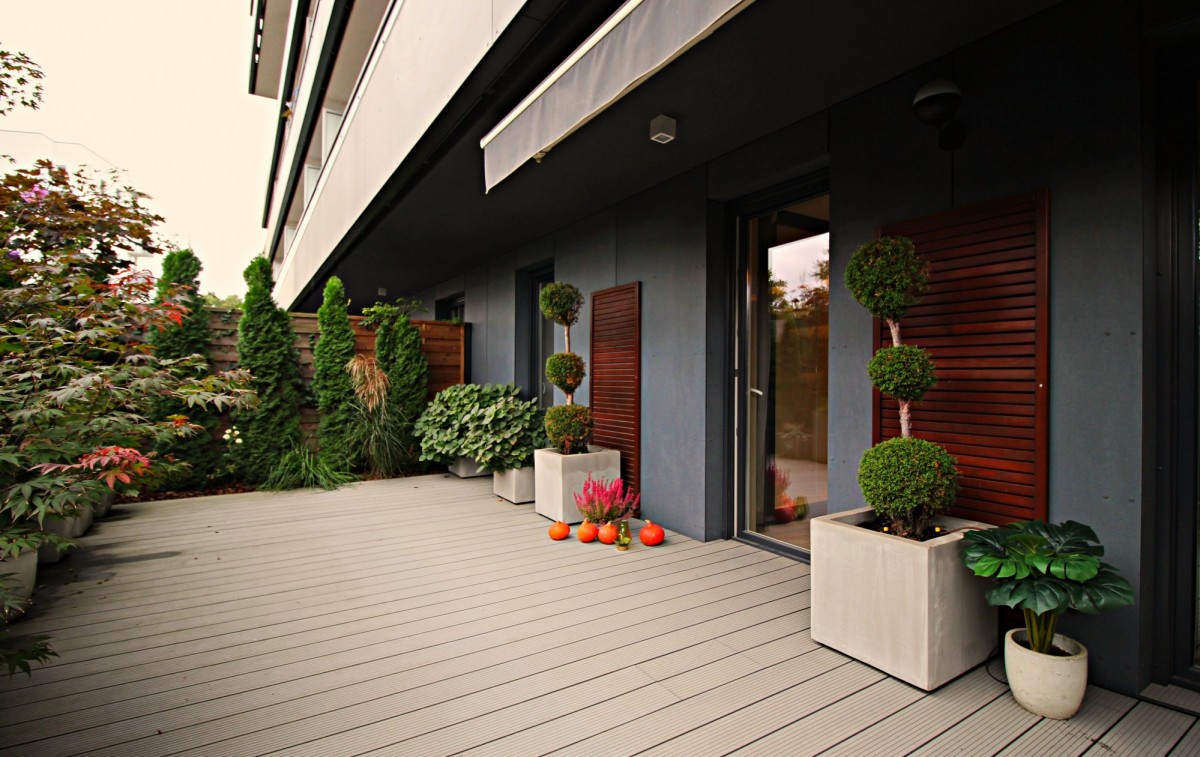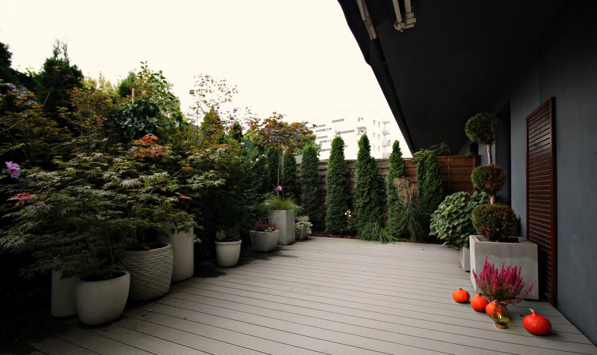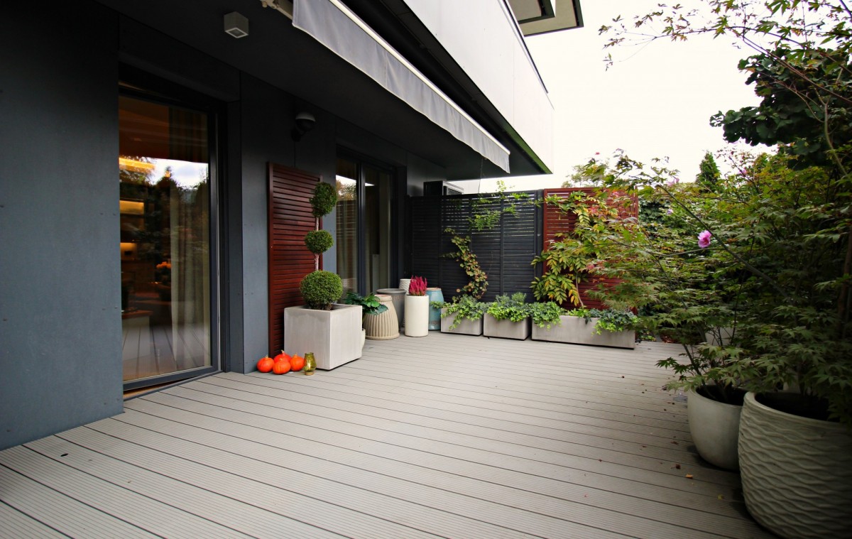 Taras z ogródkiem zagospodarowany, wysokie krzewy, oświetlenie ,automatyczne nawadnianie, elektryczna markiza .