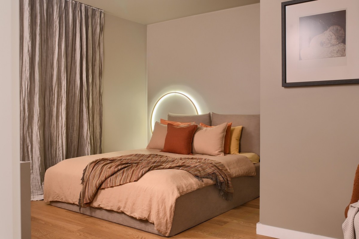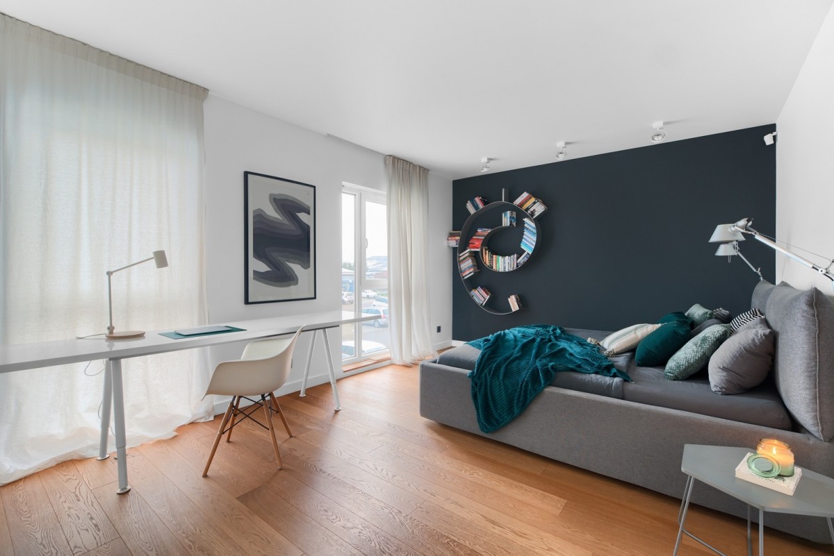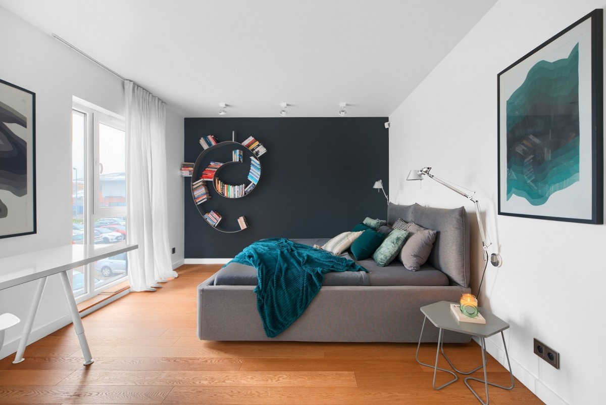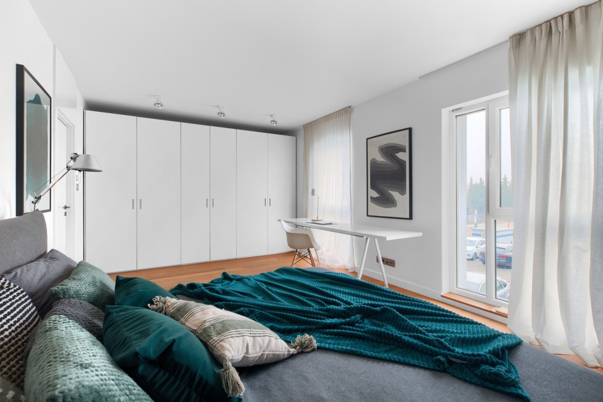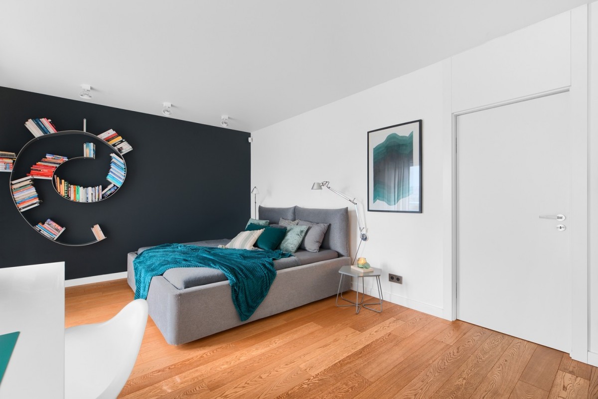 Po lewej stronie usytuowane jest wejście do pierwszej sypialni o powierzchni 21,62 m², (możliwe wydzielenia dwóch niezależnych pokoi). Na wprost znajduje się duża łazienka z prysznicem, w której pralka i suszarka zostały estetycznie ukryte za zabudową.