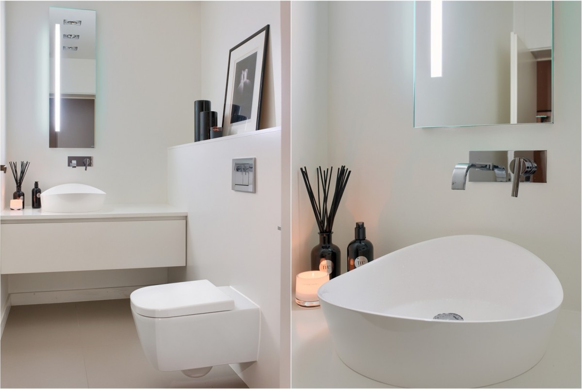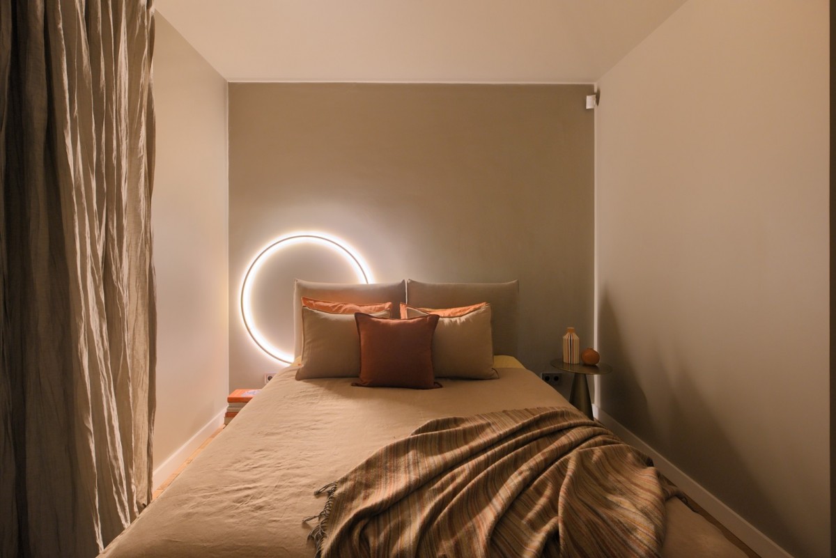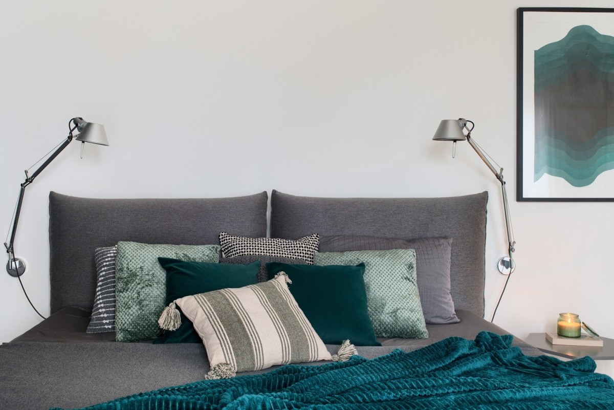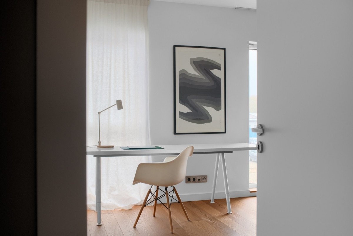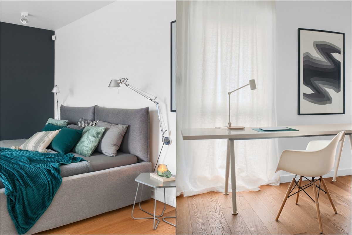 Łazienki wyposażono w armaturę Antonio Lupi oraz białą mozaikę z kolekcji Macieja Zienia. Pozostałe zabudowy meblowe wykonano na wymiar przez stolarza, a tapicerowane łóżko zostało zaprojektowane na indywidualne zamówienie.