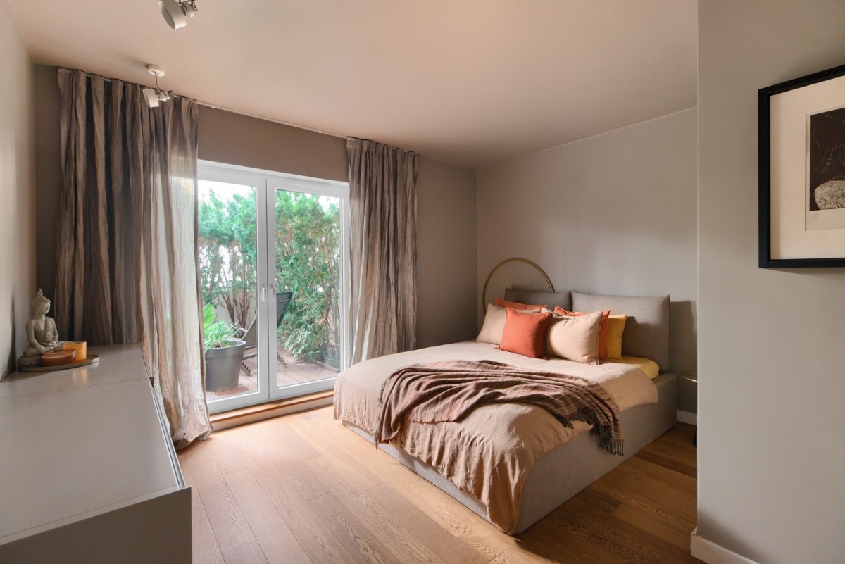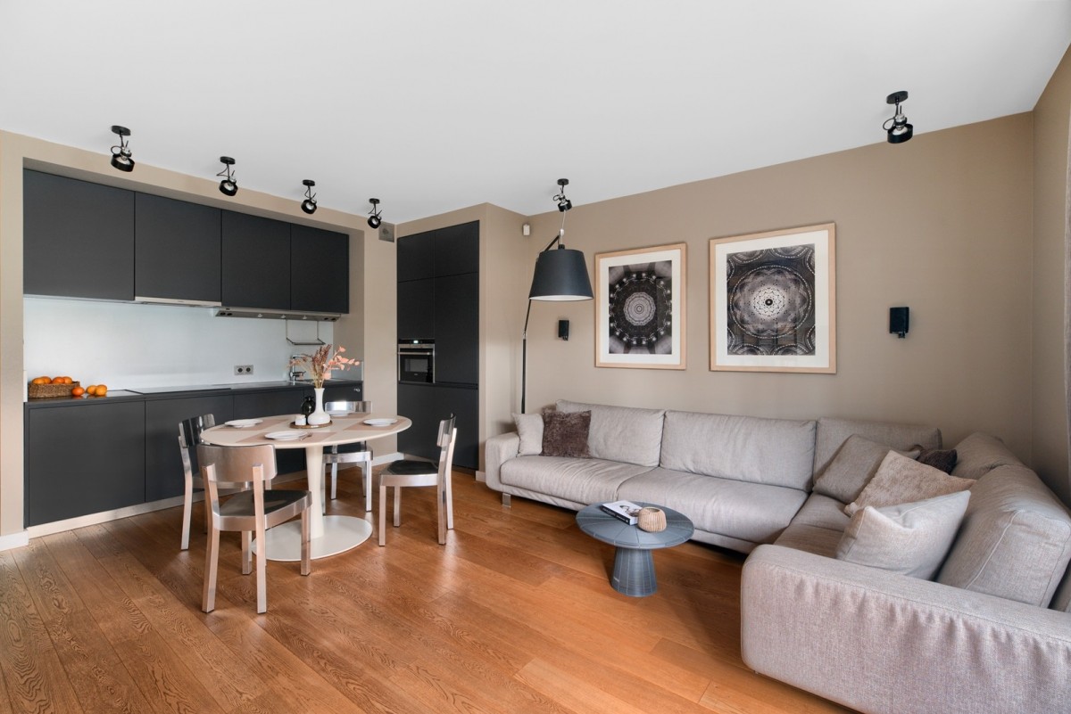 Mieszkanie zostało wykończone z dużą dbałością o detale, z wykorzystaniem wysokiej jakości materiałów. Na podłogach zastosowano elegancką deskę dębową oraz gres, co zapewnia spójne połączenie estetyki i funkcjonalności.
