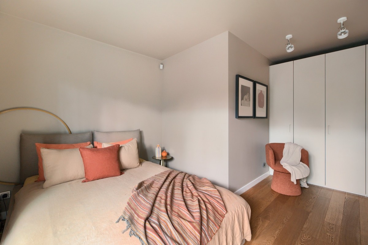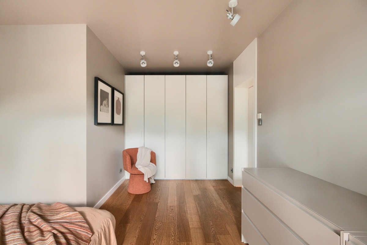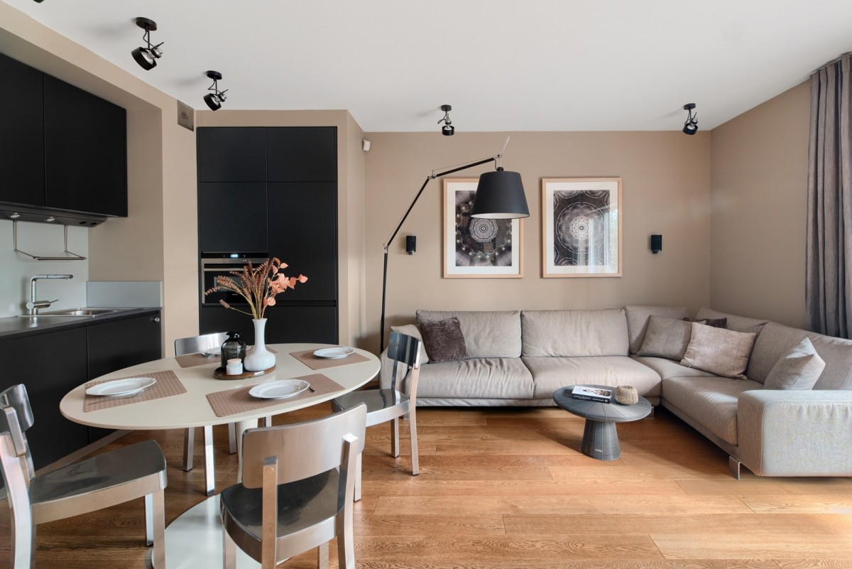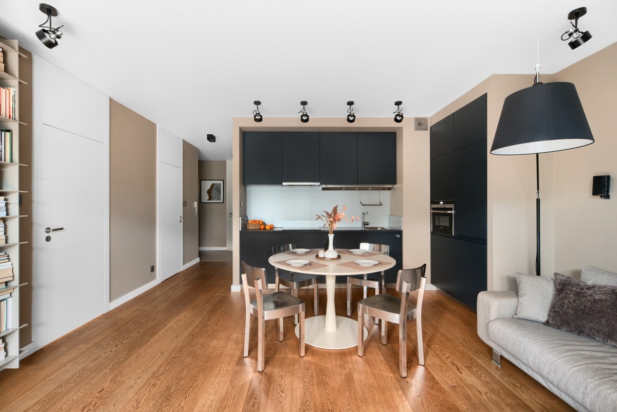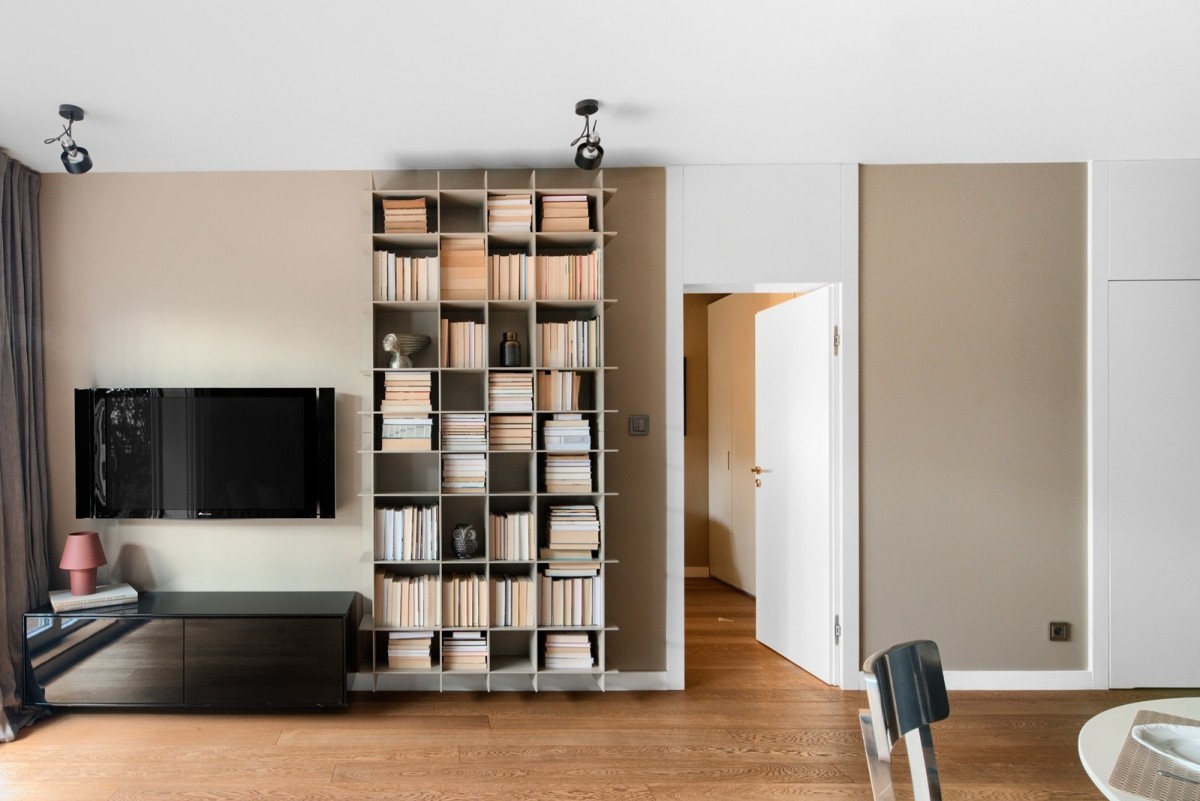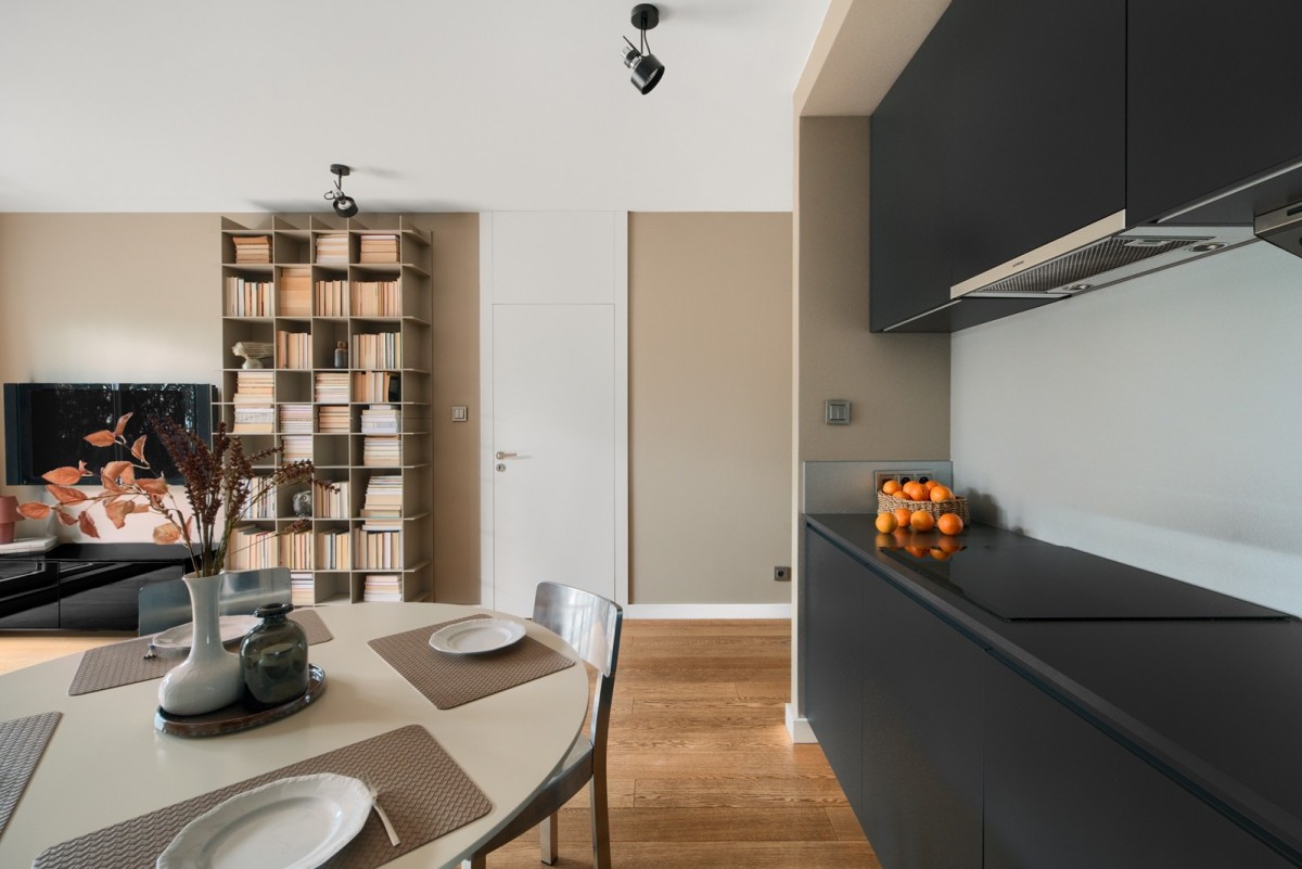 Wnętrze uzupełniają stylowe zabudowy, w tym pojemne szafy oraz kuchnia renomowanej marki Poliform.