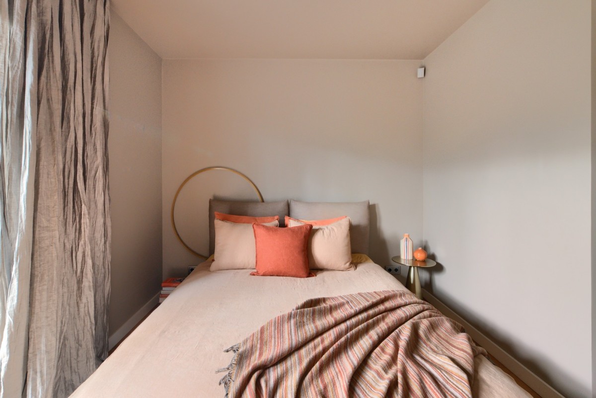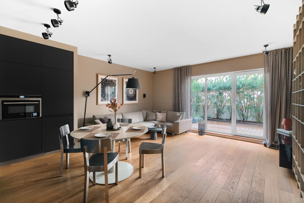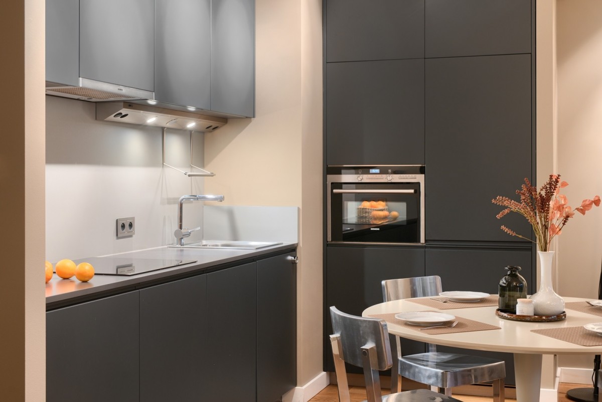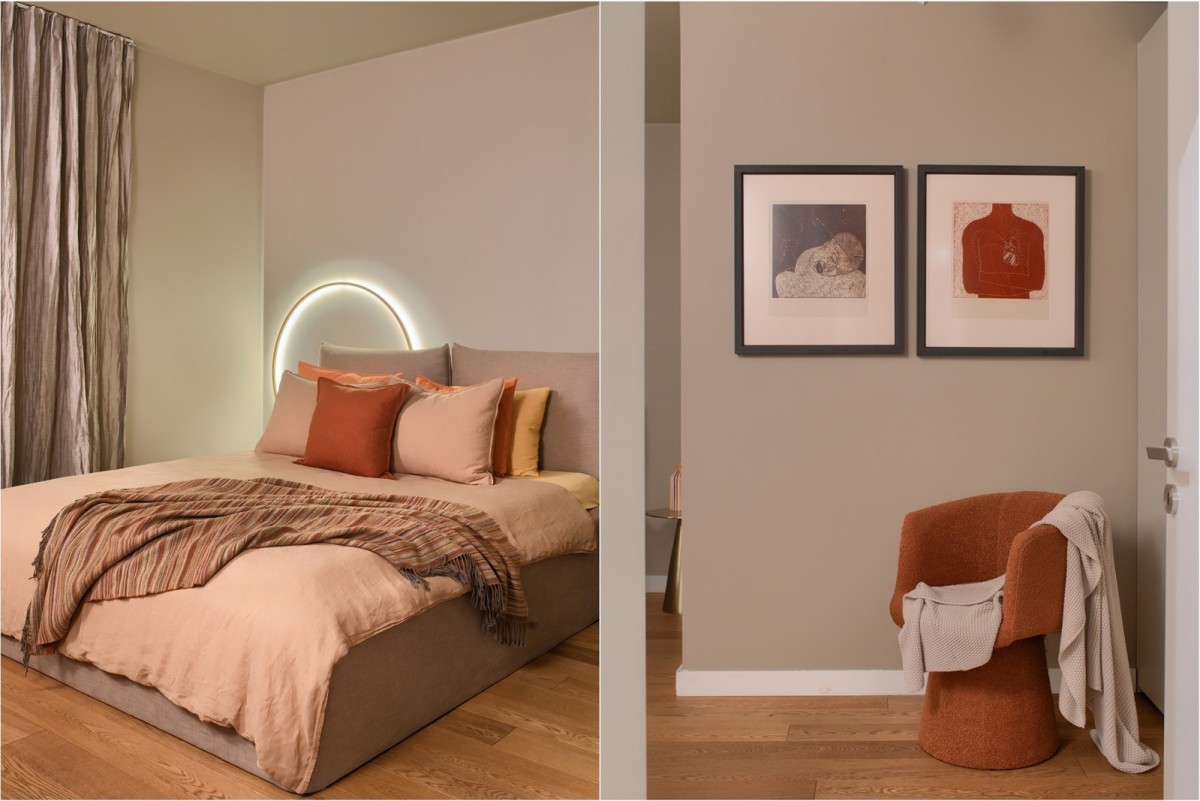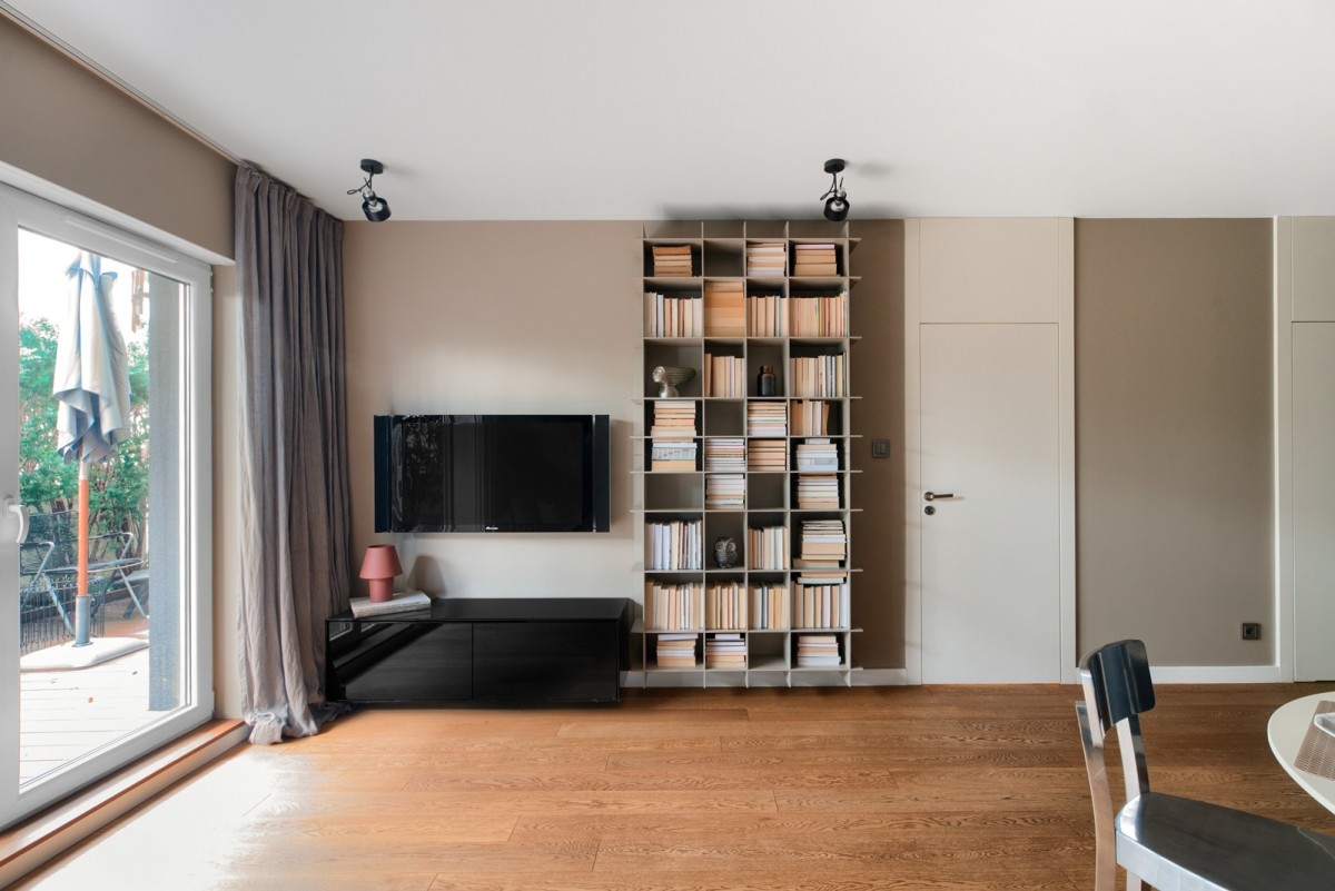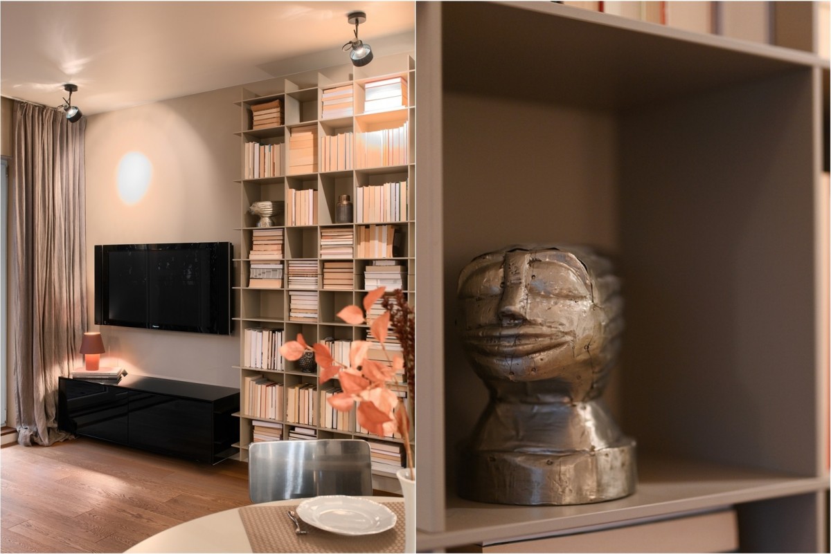 Wnętrze uzupełniają stylowe zabudowy, w tym pojemne szafy oraz kuchnia renomowanej marki Poliform.