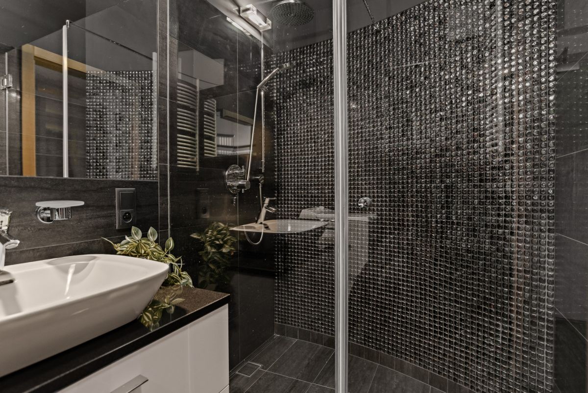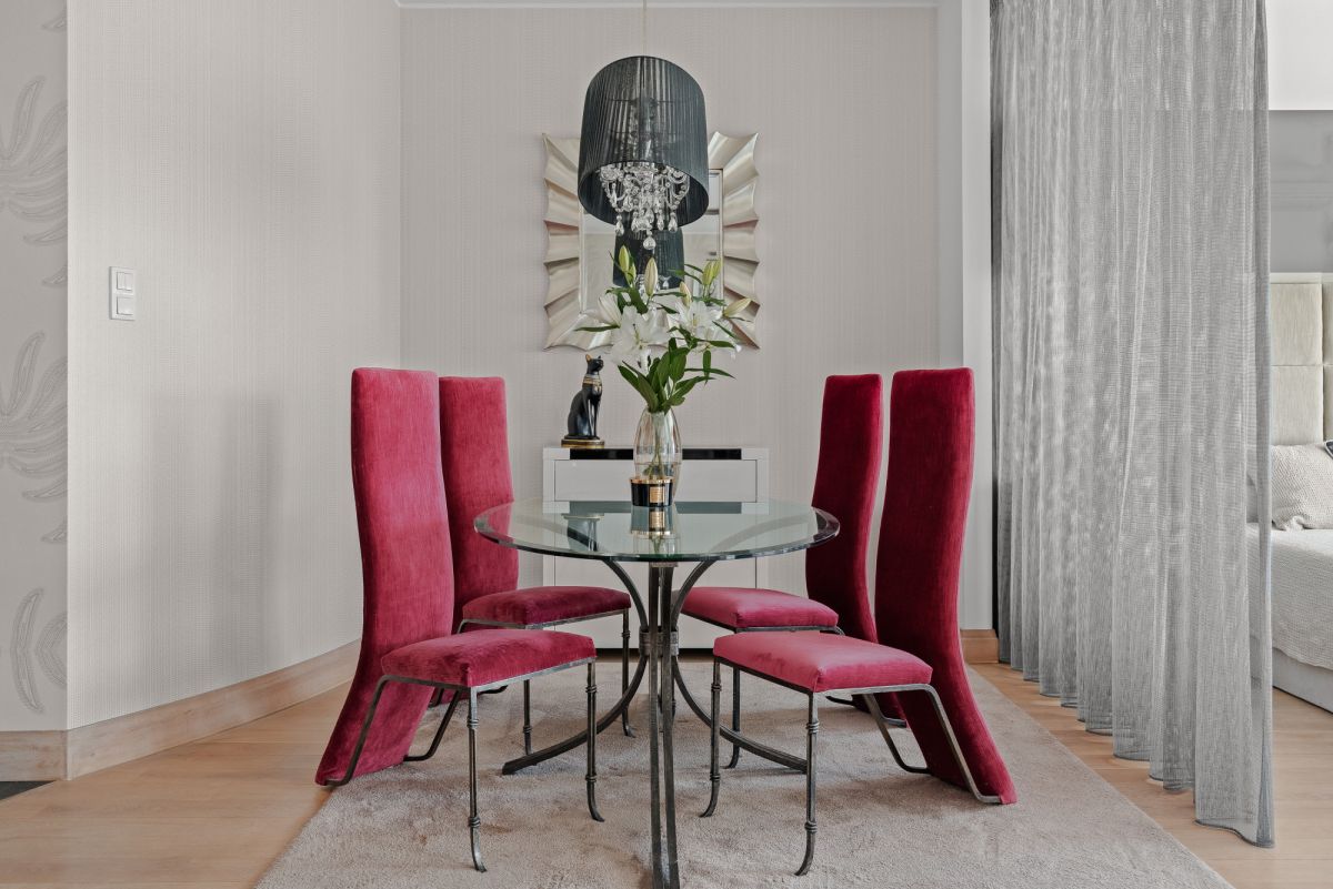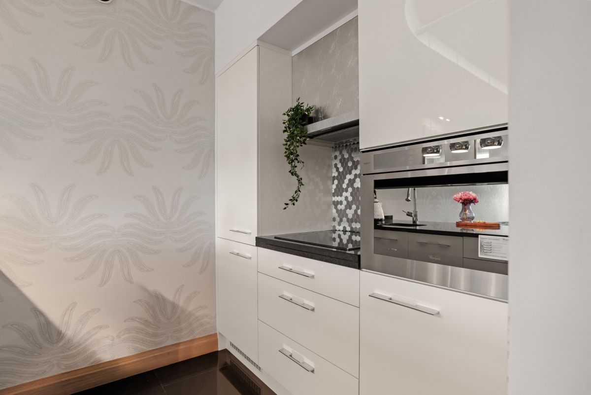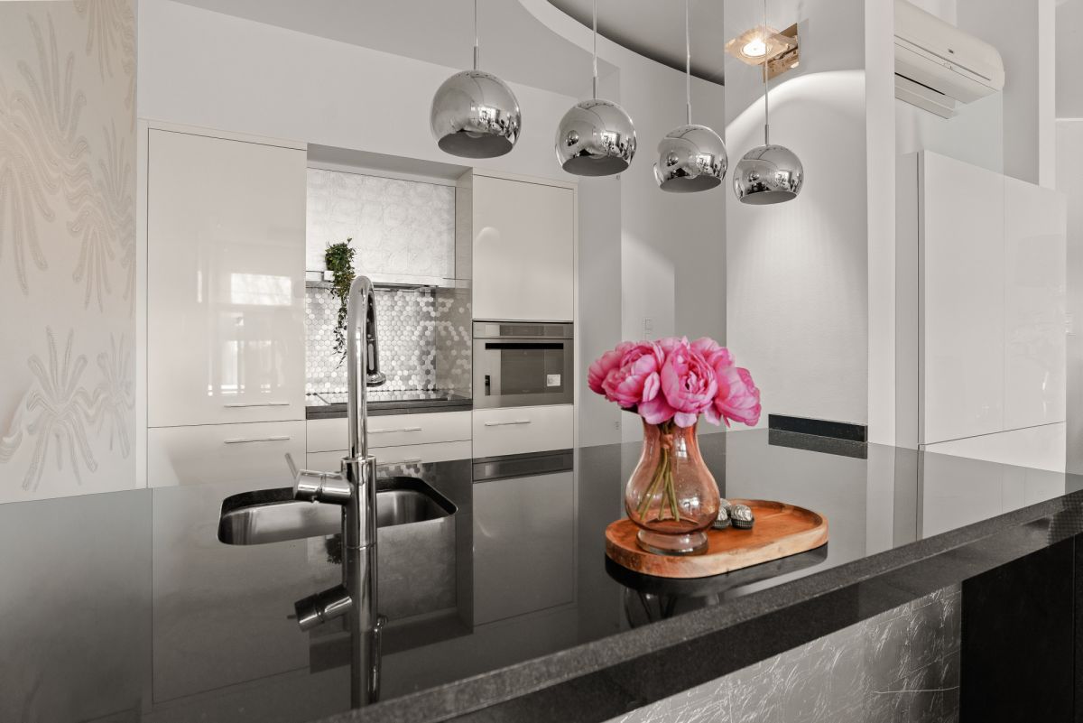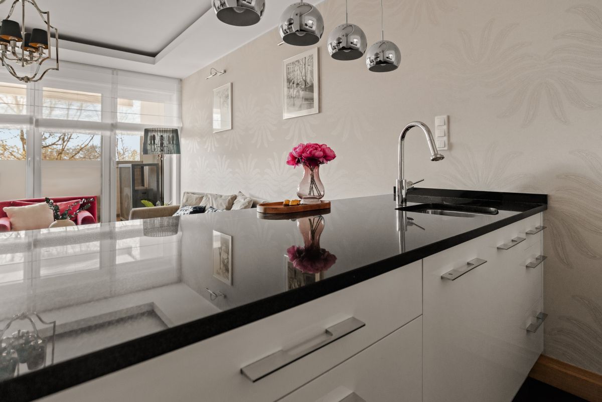 Centralnym punktem jest imponująca wyspa kuchenna z polerowanego czarnego granitu. Charakter wnętrza podkreślają ścianki dekoracyjne wykończone płatkami srebra, podłoga z bielonej deski dębowej oraz luksusowe meble marki Kalita. Dodatkowy komfort zapewnia ogrzewanie podłogowe w łazience oraz elektryczne rolety zewnętrzne. Mieszkanie znajduje się bezpośrednio nad basenem, co zapewnia naturalne ciepło podłogi.