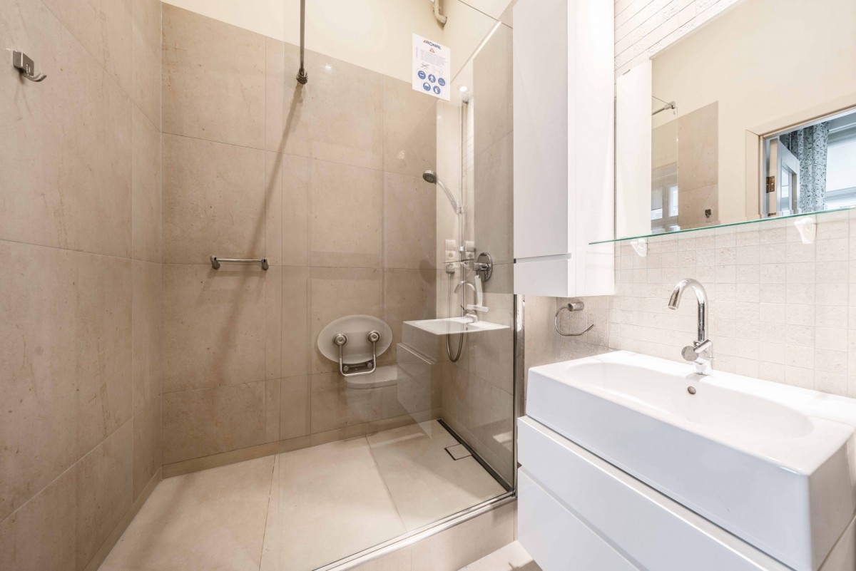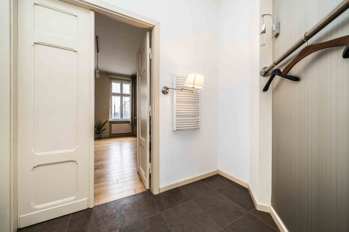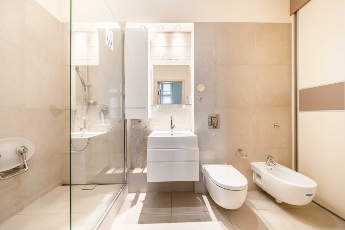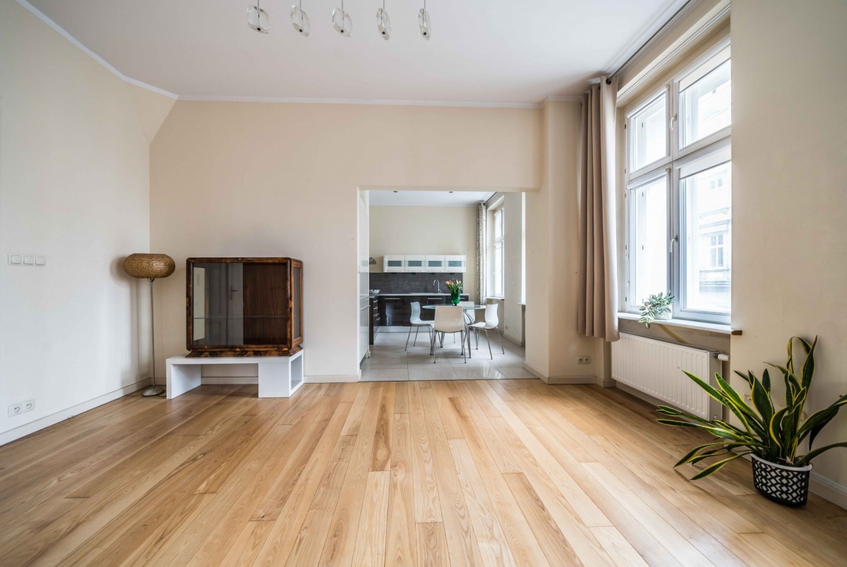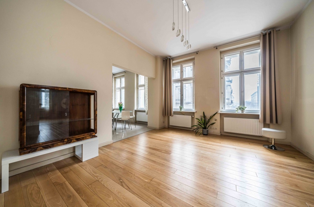 • POMIESZCZENIA: salon (ok. 29 m2, okna na ul. Święty Marcin i Ratajczaka), pokój (ok. 20 m2) połączony z kuchnią (ok. 13 m2), łazienka (ok. 5 m2, z obszerną kabiną prysznicową, WC i bidetem, duża szafa w zabudowie z pralką i piecem gazowym), przedsionek (ok. 4 m2, wnęka z półkami);