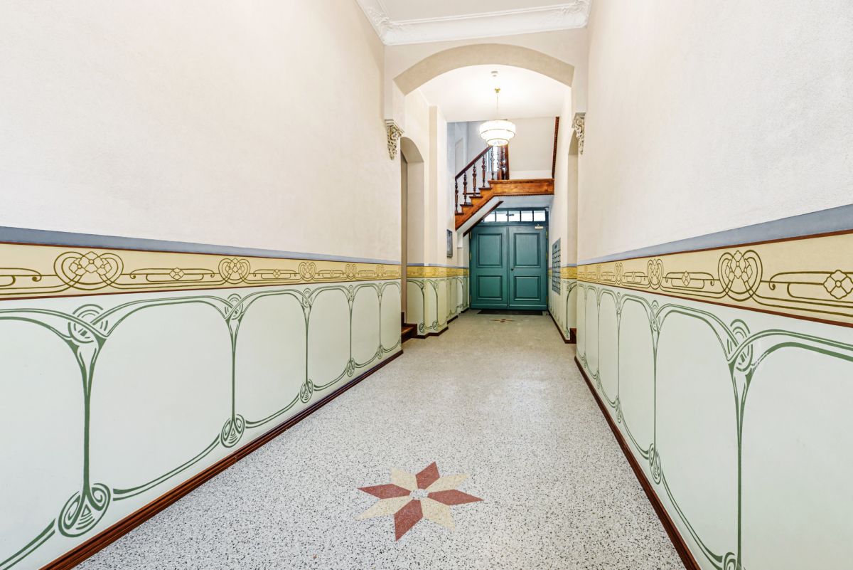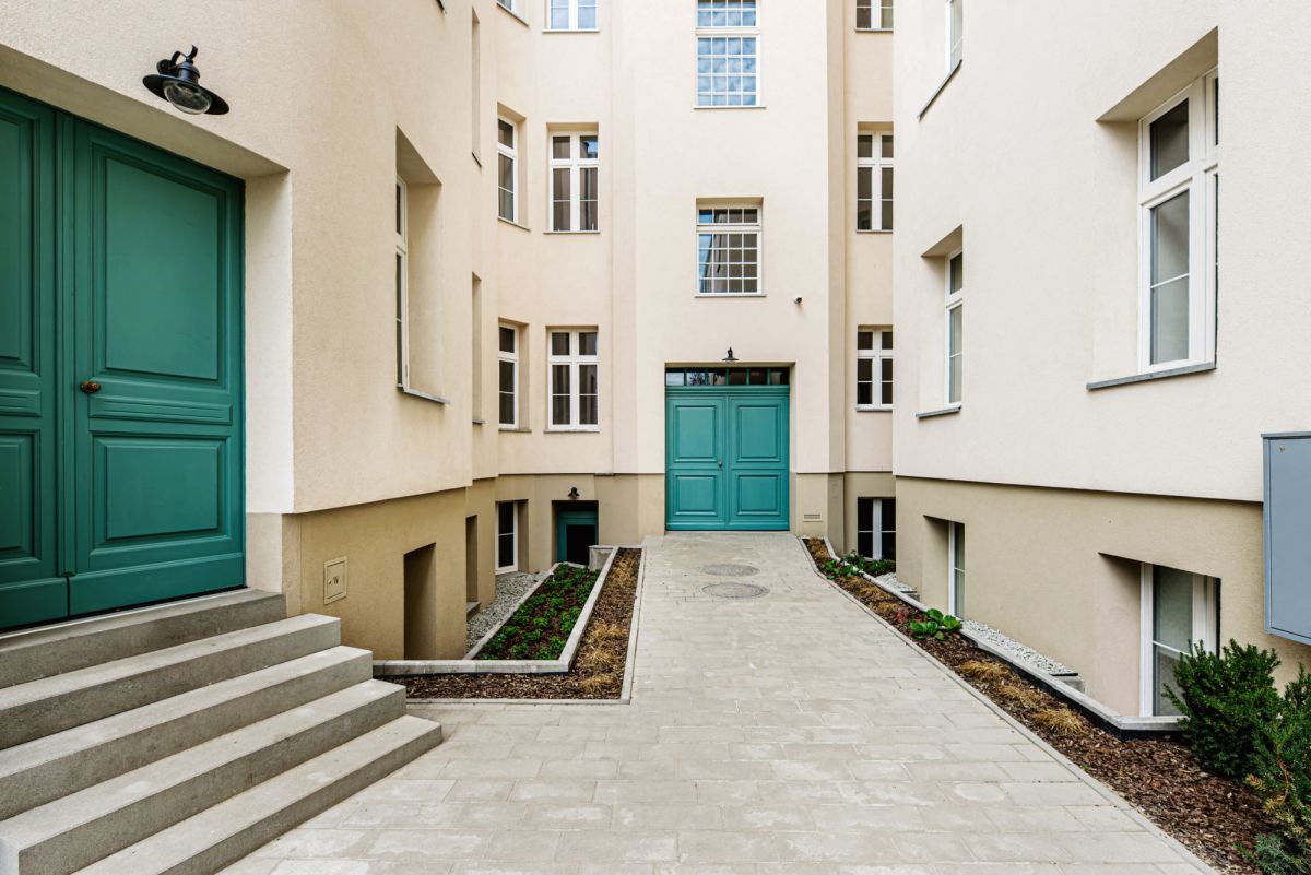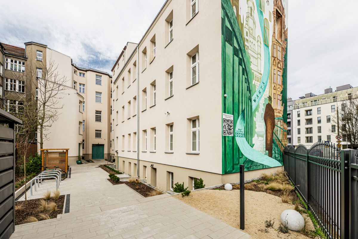 Kamienica po rewitalizacji ozdobiona efektownym muralem, piękna, zadbana klatka schodowa z oryginalnymi gzymsami i rzeźbami, odnowione drewniane schody, klimatyczny dziedziniec z ławeczkami i roślinnością, gdzie można odpocząć po ciężkim dniu pracy.