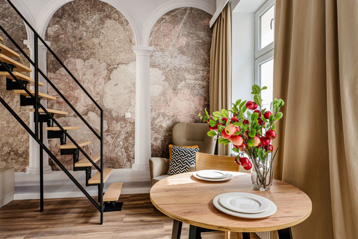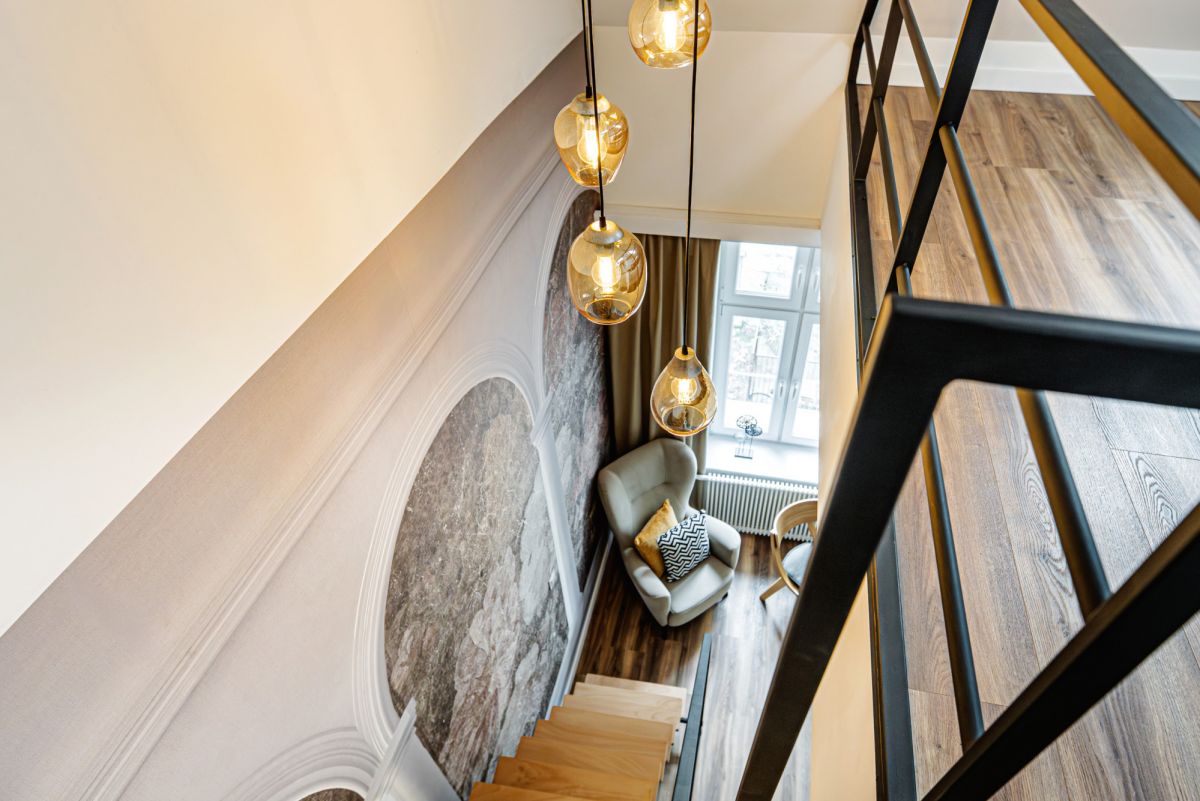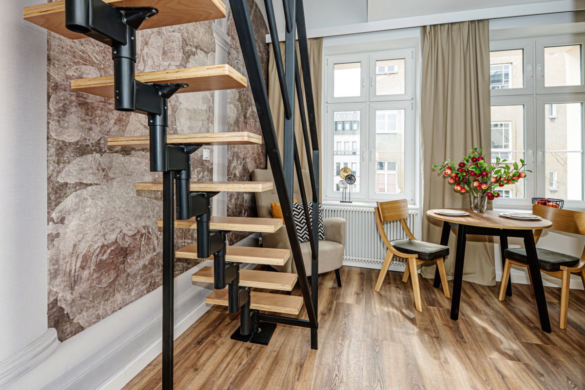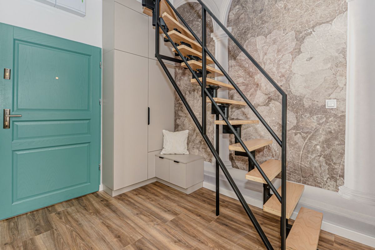Kamienica po rewitalizacji ozdobiona efektownym muralem, piękna, zadbana klatka schodowa z oryginalnymi gzymsami i rzeźbami, odnowione drewniane schody, klimatyczny dziedziniec z ławeczkami i roślinnością, gdzie można odpocząć po ciężkim dniu pracy.