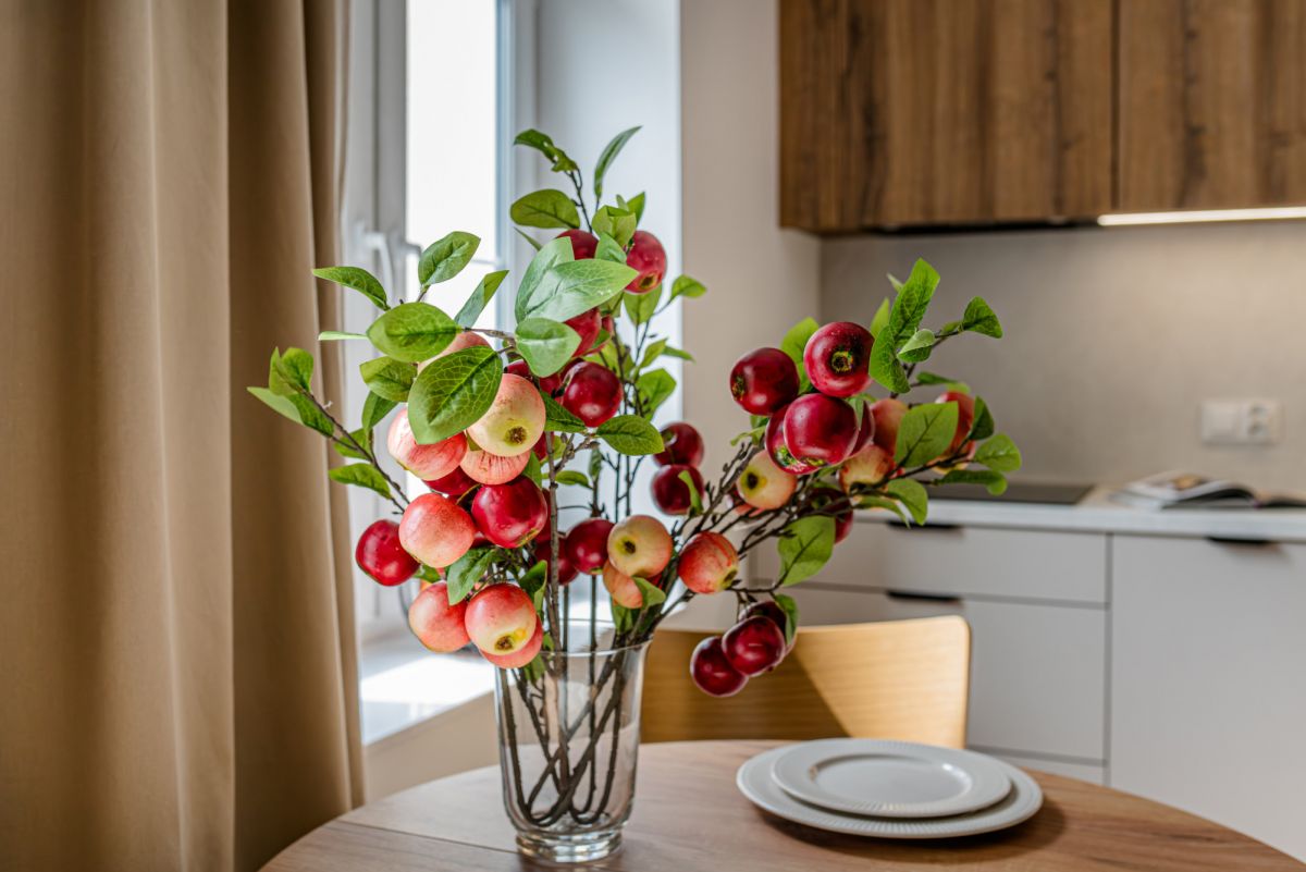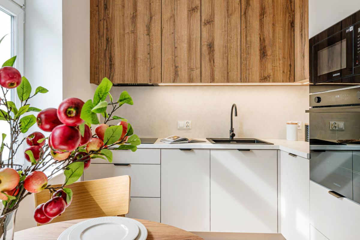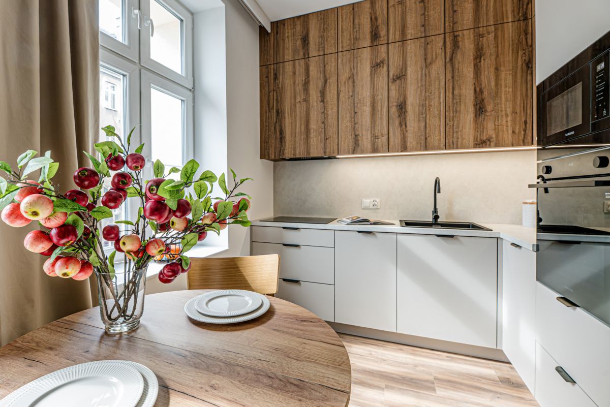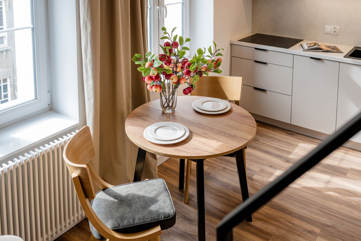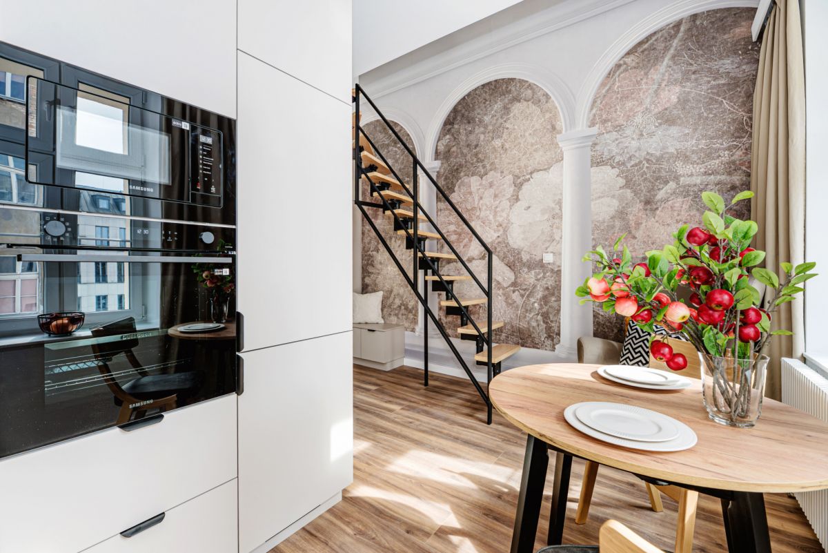 - pokój z aneksem kuchennym: zabudowa kuchenna: szafki dolne, górne do sufitu, podświetlone, ze sprzętem AGD: piekarnik, okap, kuchenka mikrofalowa, płyta indukcyjna, okrągły stół, krzesła, fotel. Zamontowano klimatyzację, która podnosi komfort życia, zapewnia odpowiednie warunki do pracy, wypoczynku i snu.