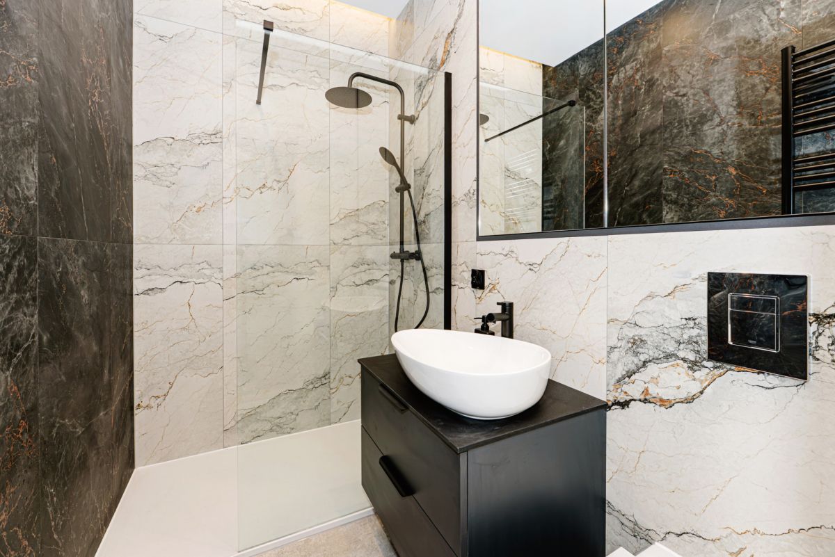- w łazience prysznic ze szklaną ścianką , deszczownicą i baterią prysznicową, umywalka osadzona na szafce, WC geberit