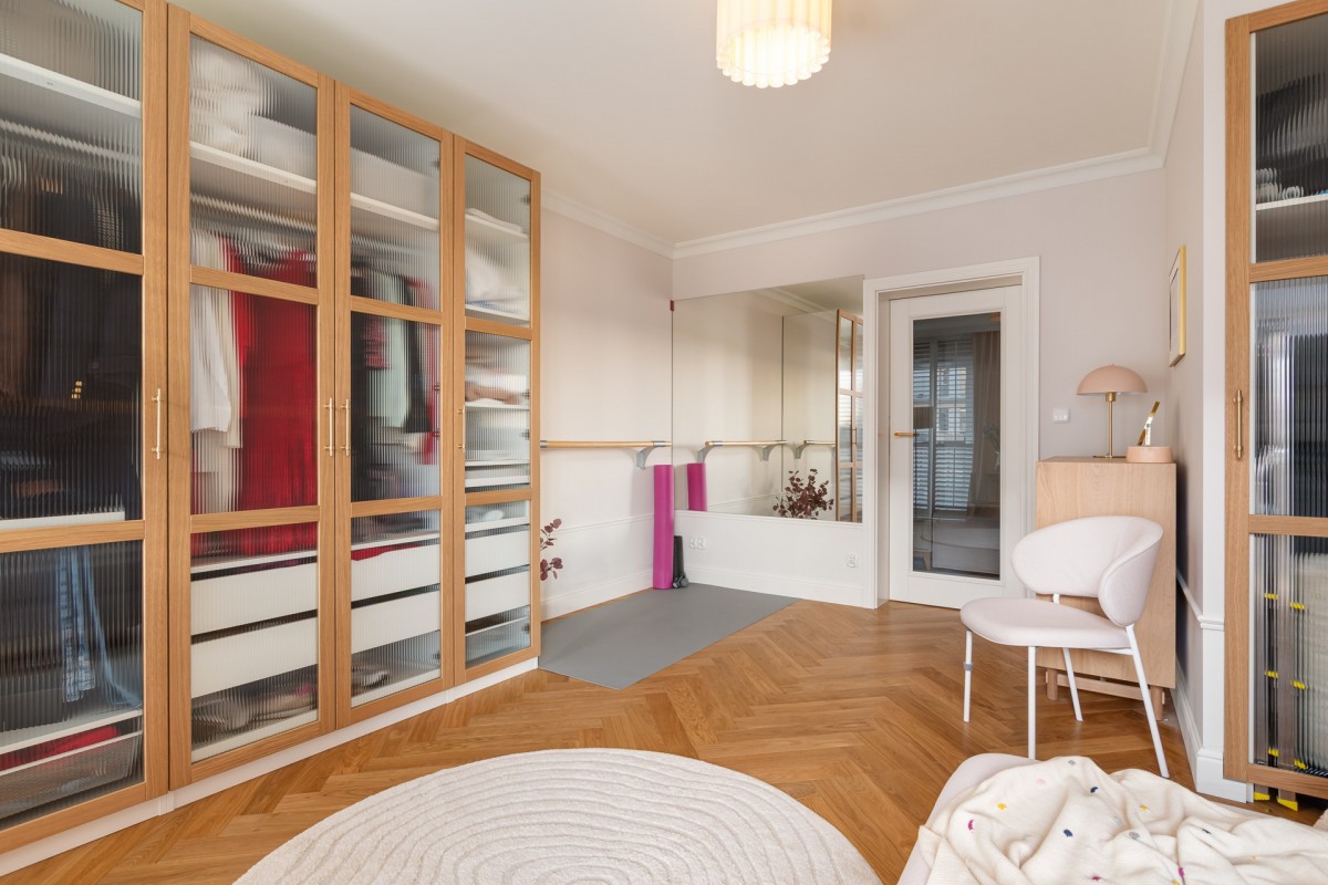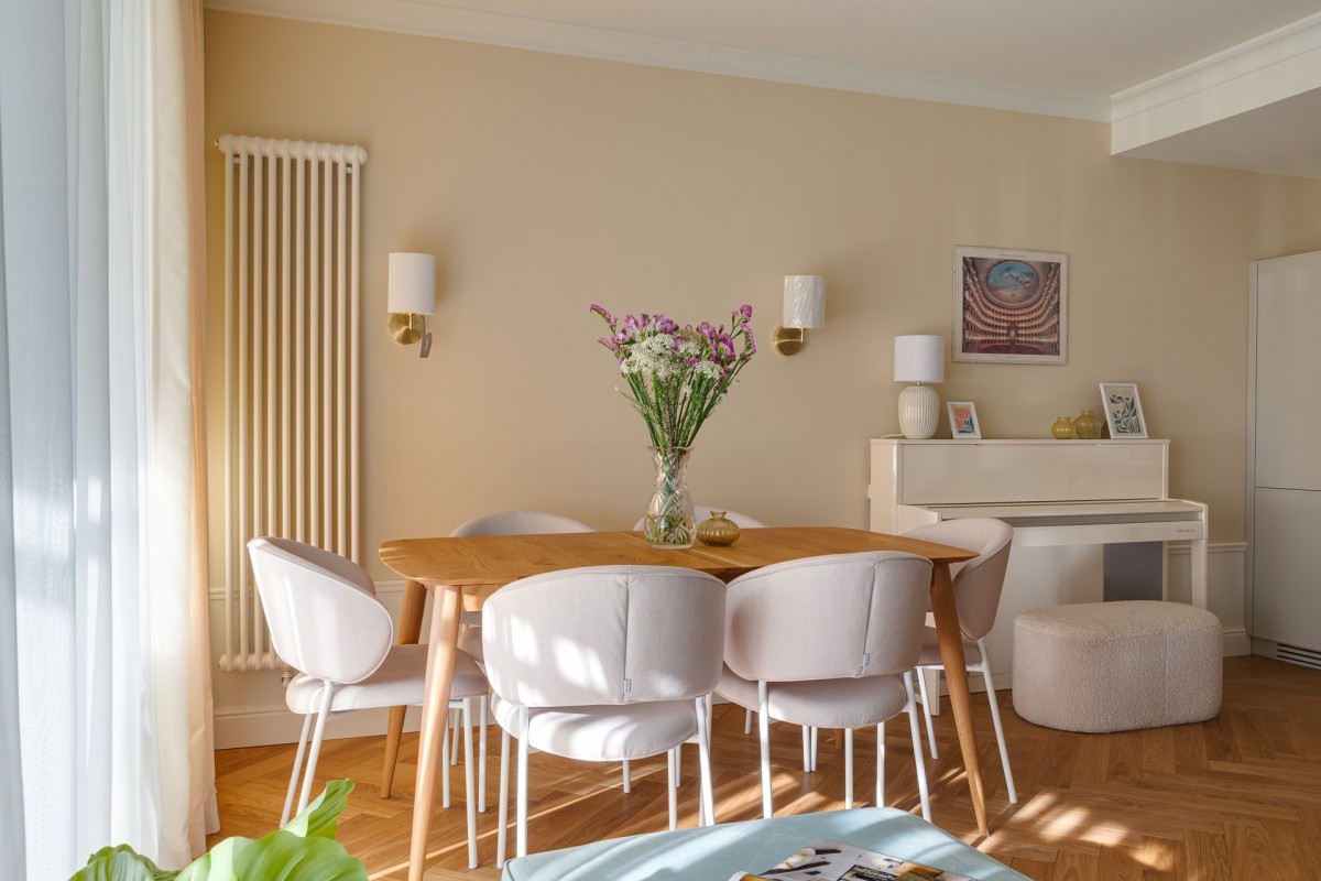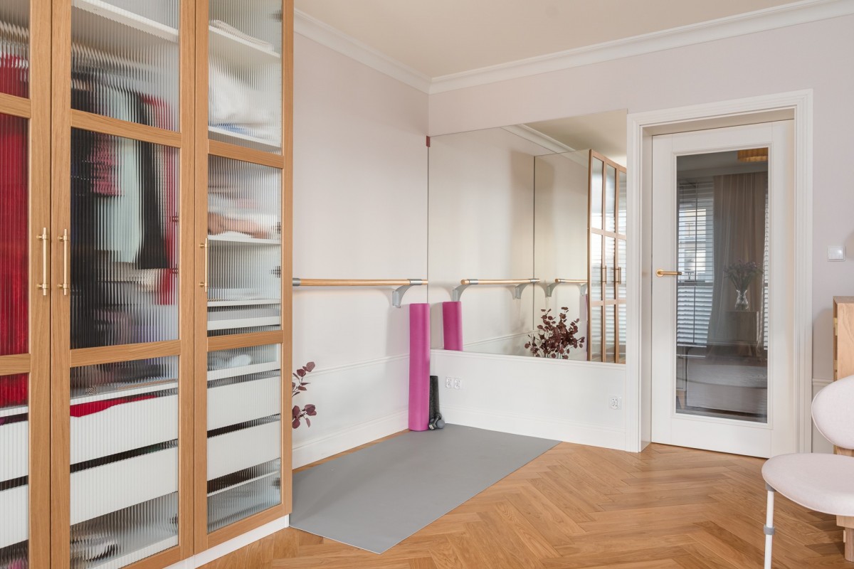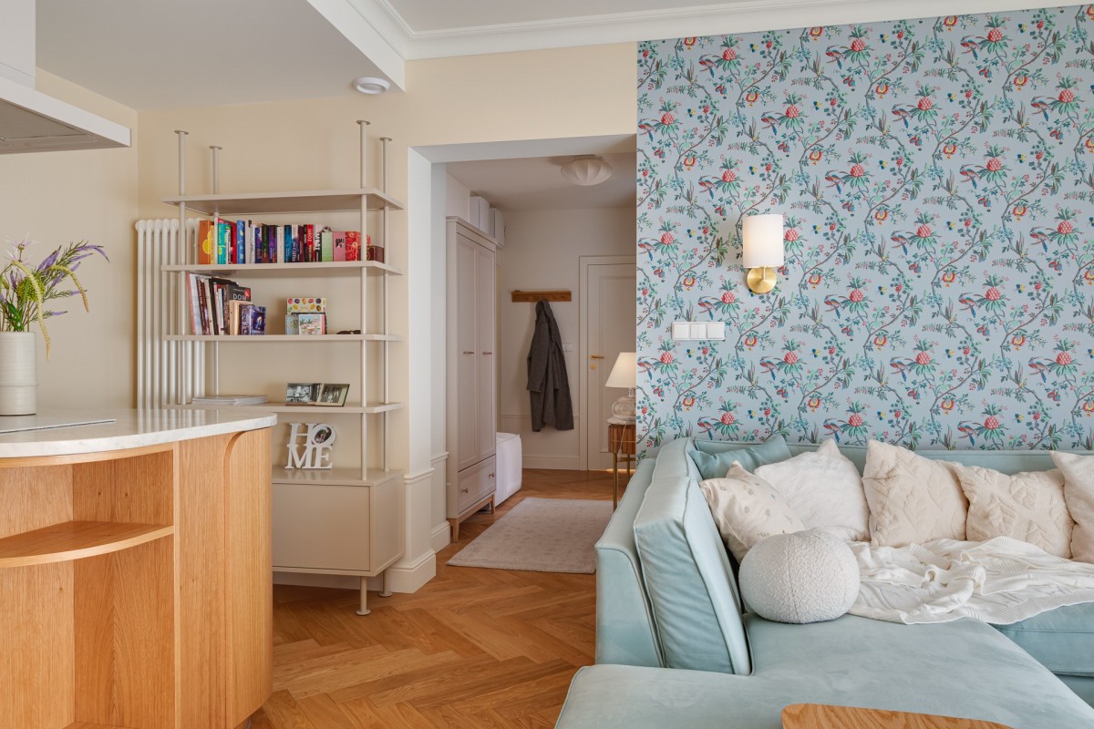 Całość aranżacji dopełniają starannie dobrane tapety klasy premium, eleganckie sztukaterie oraz wielostrefowe, nastrojowe oświetlenie, które pozwala kreować atmosferę dopasowaną do pory dnia i okazji. Zabudowy stolarskie wykonane z naturalnego forniru tworzą harmonijną całość z designerskimi meblami o miękkich, giętych liniach. Duże lustra dodatkowo potęgują wrażenie przestrzeni i światła.