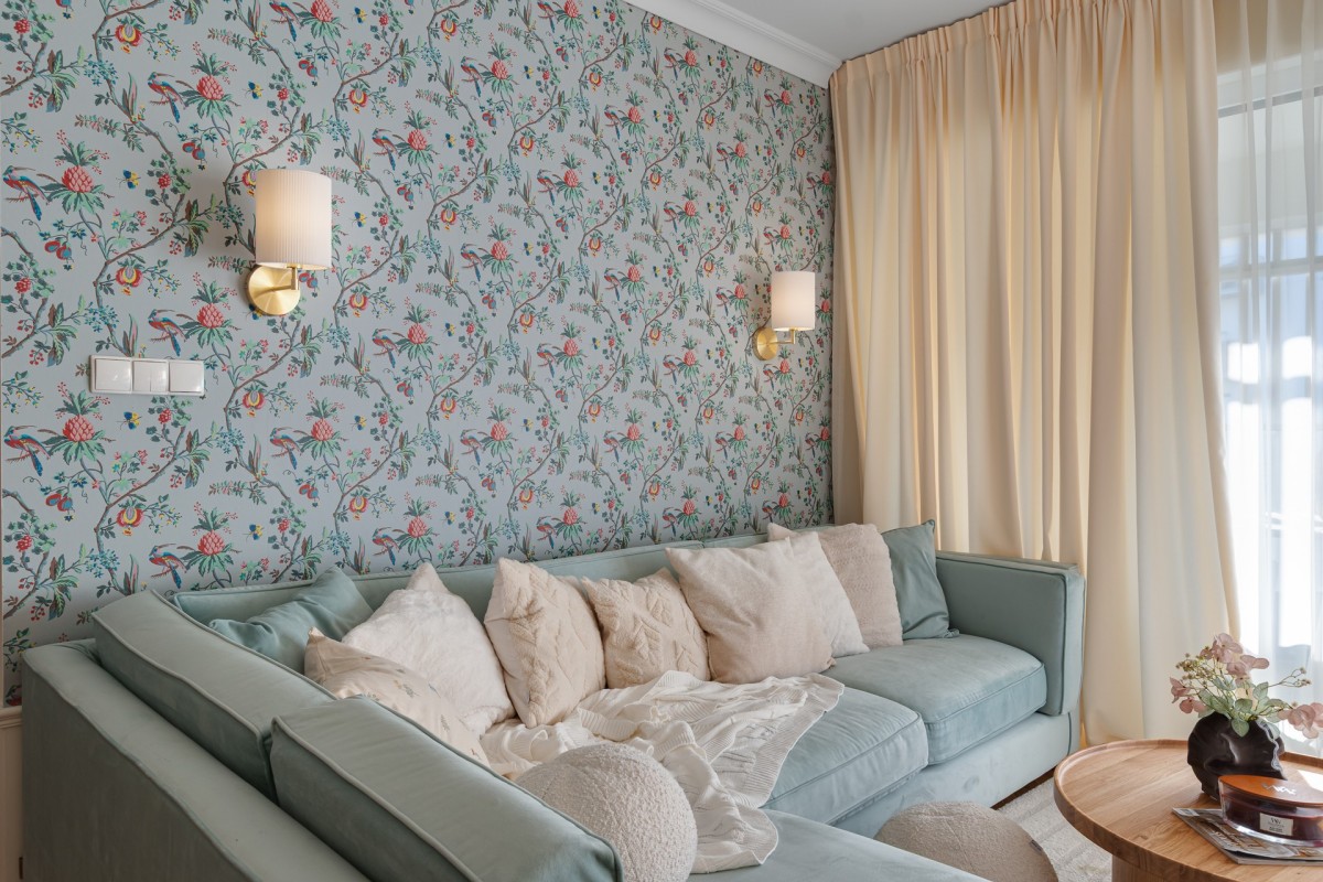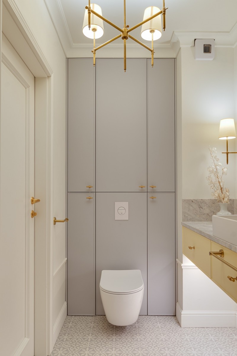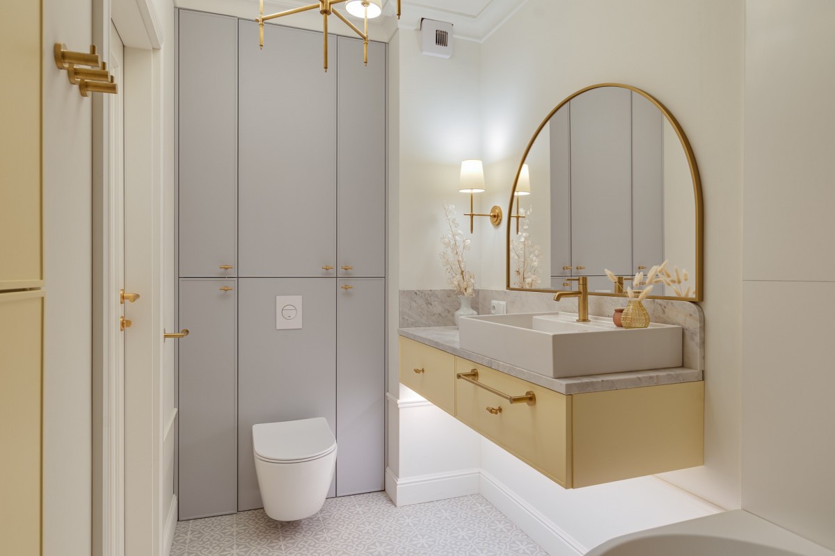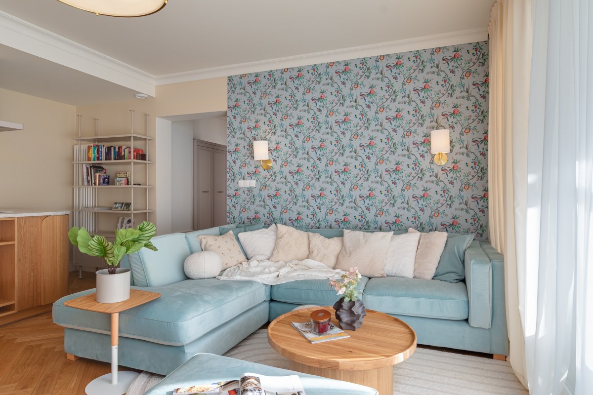 Całość aranżacji dopełniają starannie dobrane tapety klasy premium, eleganckie sztukaterie oraz wielostrefowe, nastrojowe oświetlenie, które pozwala kreować atmosferę dopasowaną do pory dnia i okazji. Zabudowy stolarskie wykonane z naturalnego forniru tworzą harmonijną całość z designerskimi meblami o miękkich, giętych liniach. Duże lustra dodatkowo potęgują wrażenie przestrzeni i światła.