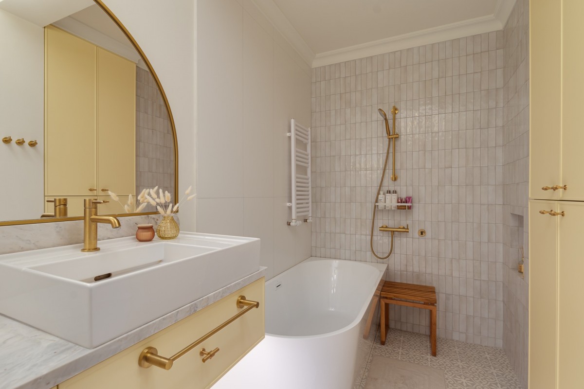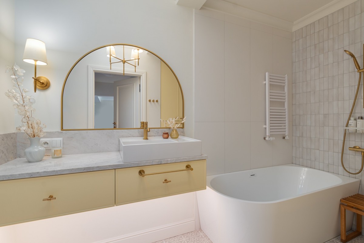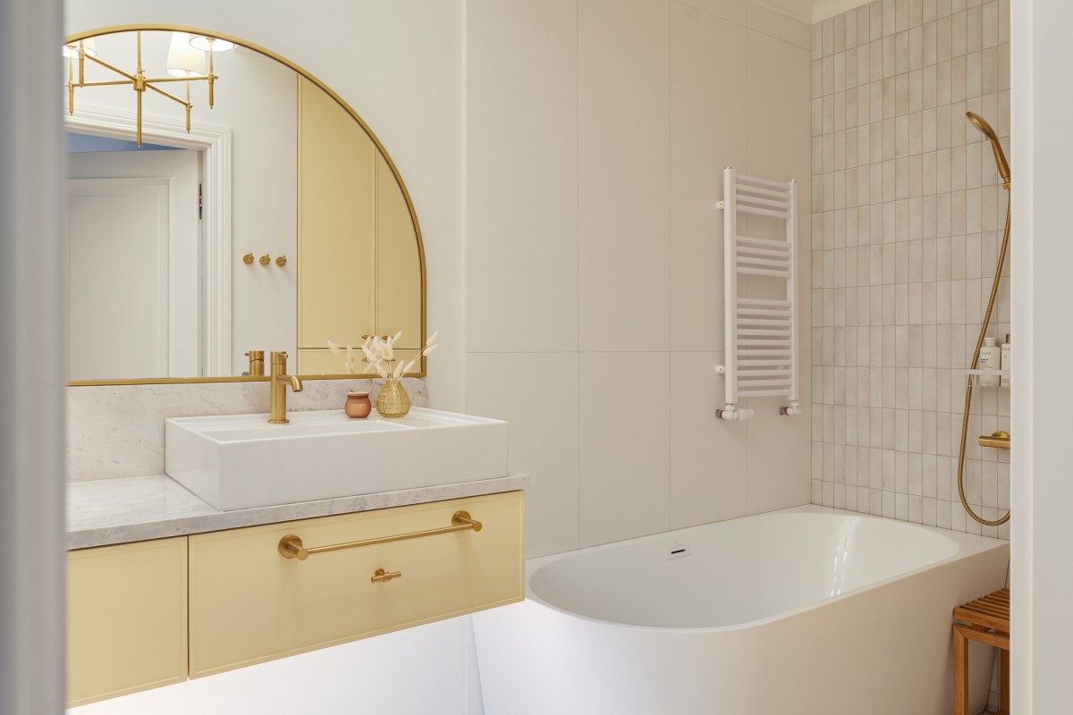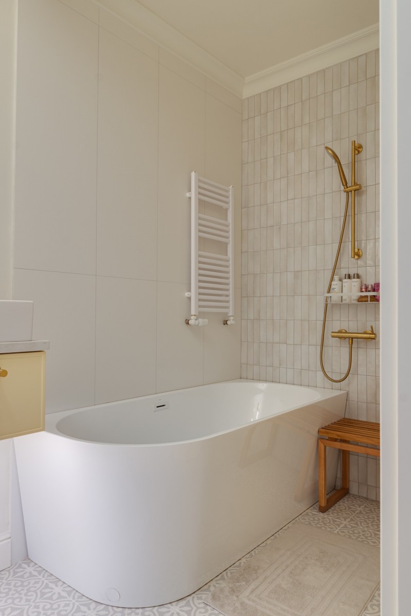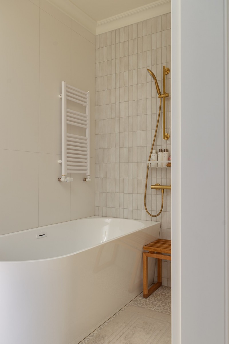 Łazienka została zaprojektowana jako elegancka strefa relaksu z wanną, z możliwością łatwej adaptacji i wydzielenia przestrzeni prysznicowej - zgodnie z indywidualnymi preferencjami przyszłego właściciela.