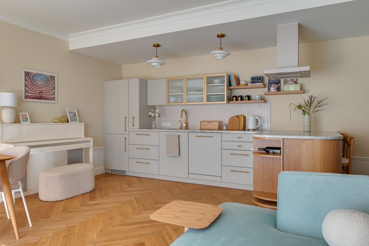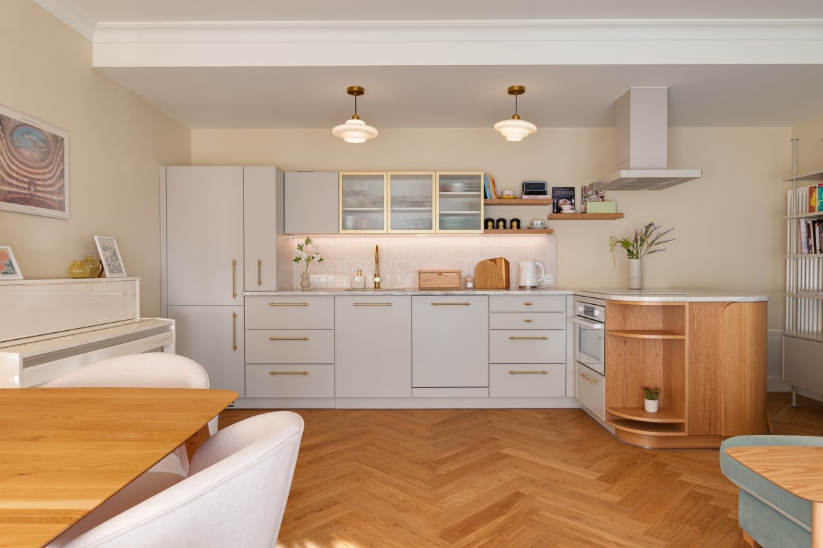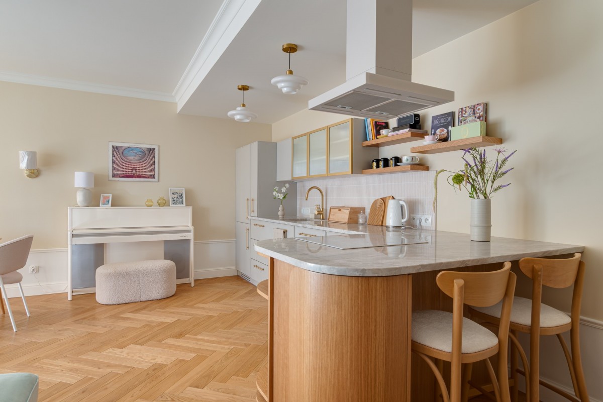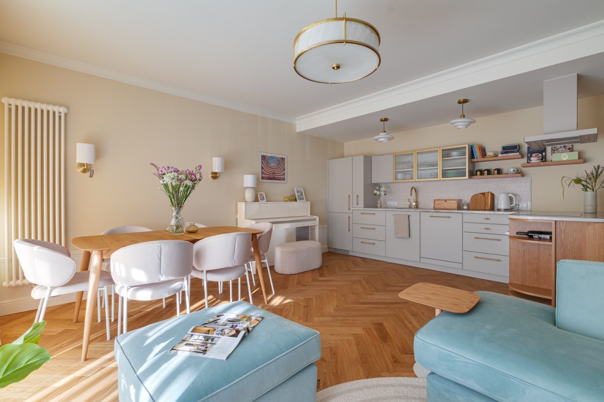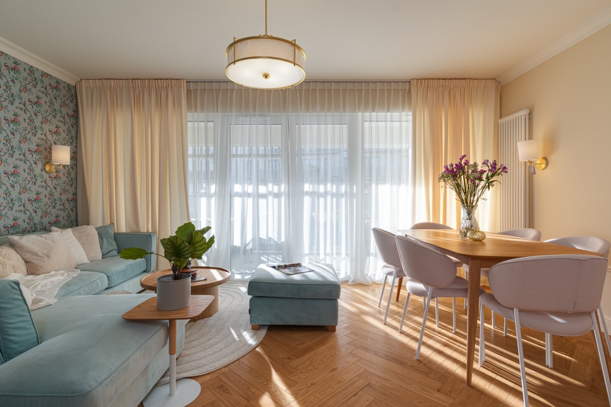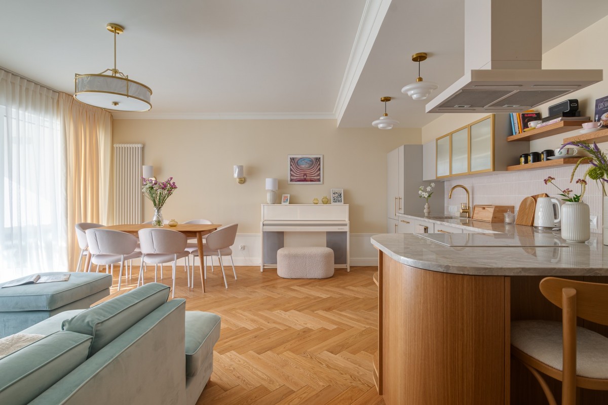Wnętrze zostało zaprojektowane w sposób spójny i ponadczasowy, z wyraźnym naciskiem na detal oraz najwyższą jakość zastosowanych materiałów. Na podłogach znajduje się lite drewno dębowe (wykończenie matowym lakierem, realizacja firmy Walczak), które nadaje przestrzeni elegancki, naturalny charakter. Blaty w kuchni oraz łazience wykonano z granitu, natomiast subtelny akcent marmuru na konsoli w korytarzu podkreśla ekskluzywny styl wnętrza.