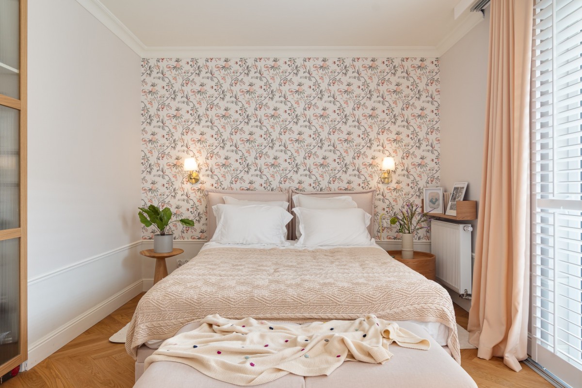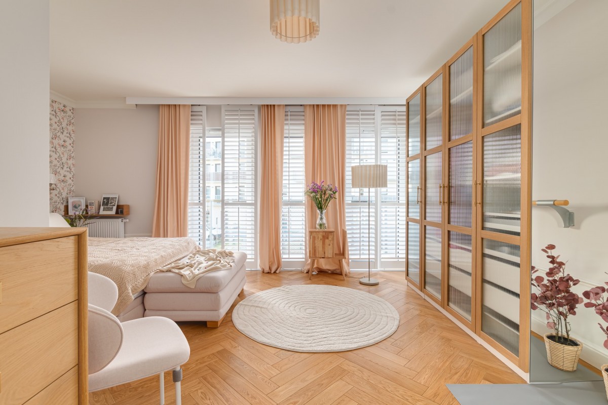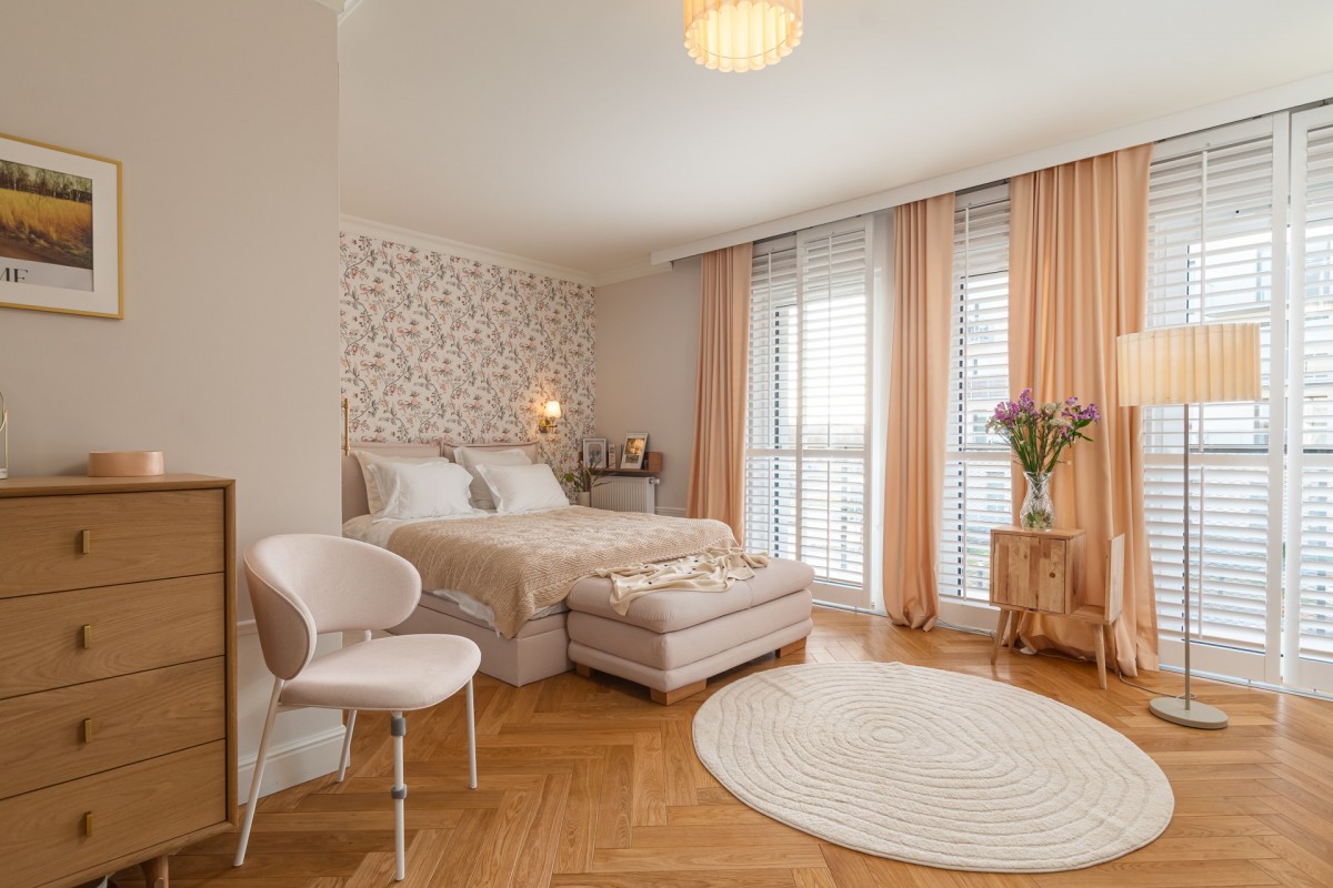 Mieszkanie wyróżniają ponadstandardowe wysokości sufitów, które nadają wnętrzu oddechu i lekkości. Komfort codziennego użytkowania podnoszą rolety zewnętrzne oraz shuttersy w sypialni, zapewniające prywatność i doskonałą kontrolę światła.