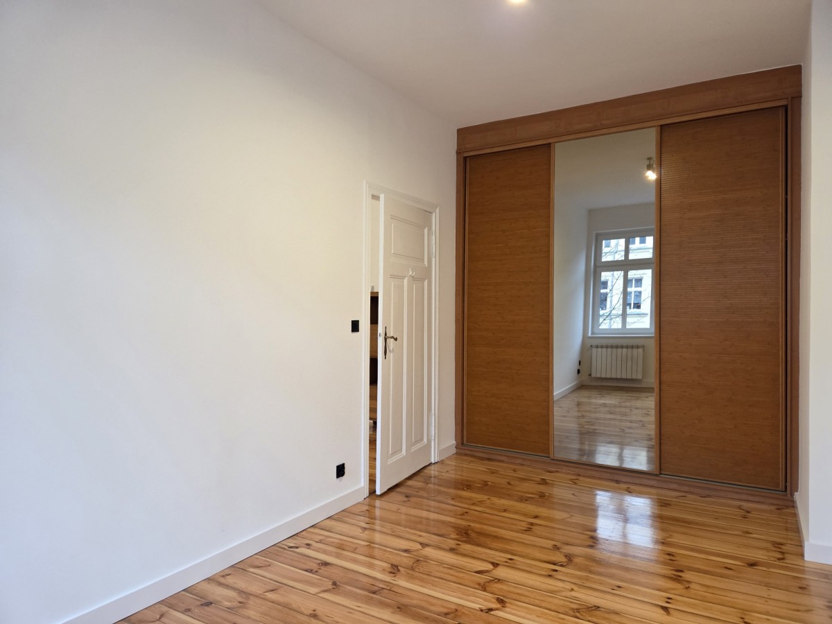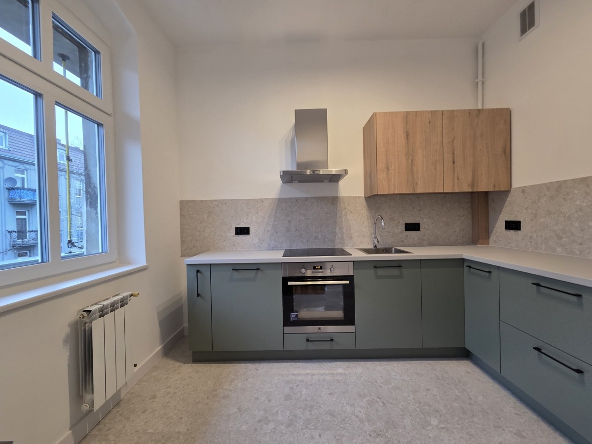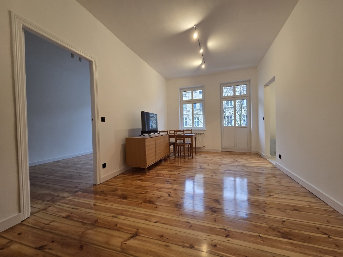 Świeżo wyremontowany lokal o pow. 58,5m2 składa się z dwóch pokoi, kuchni, łazienki oraz korytarza. Idealnie skomponowany nowoczesny wystrój w połączeniu z oryginalnymi elementami wykończenia - odrestaurowanymi, starymi deskami podłogowymi, drzwiami wewnętrznymi, przestronnymi wysokimi pomieszczeniami podkreśla kamieniczny charakter całego wnętrza.