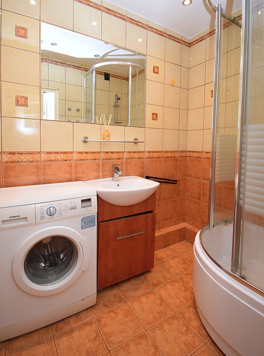 w łazience i kuchni odpowiednio płytki.